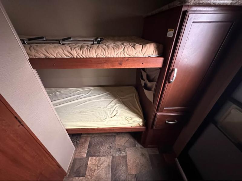 Step inside using either of the two side entry doors. The door up front leads you to the bath and front set of bunk beds. There are also two wardrobes, one at the foot of the bunk beds and a second smaller one just inside the door to your left with a TV shelf above it.