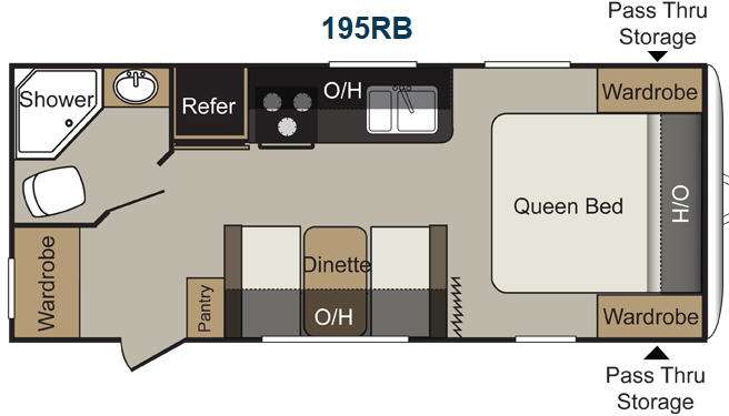 This Passport Express travel trailer model 195RB features a rear corner bath, and all the amenities you need to take your camping up a notch!
