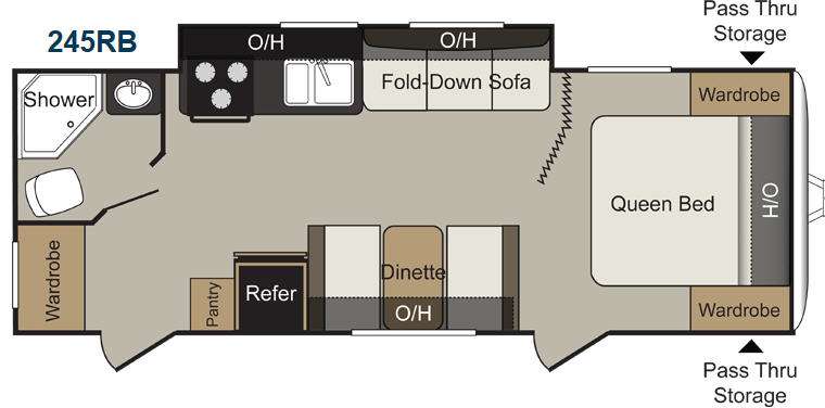 The large single slide out in Passport Express model 245RB is the reason for the spacious interior. This travel trailer also features a rear bath layout, and dual entry doors for added convenience.