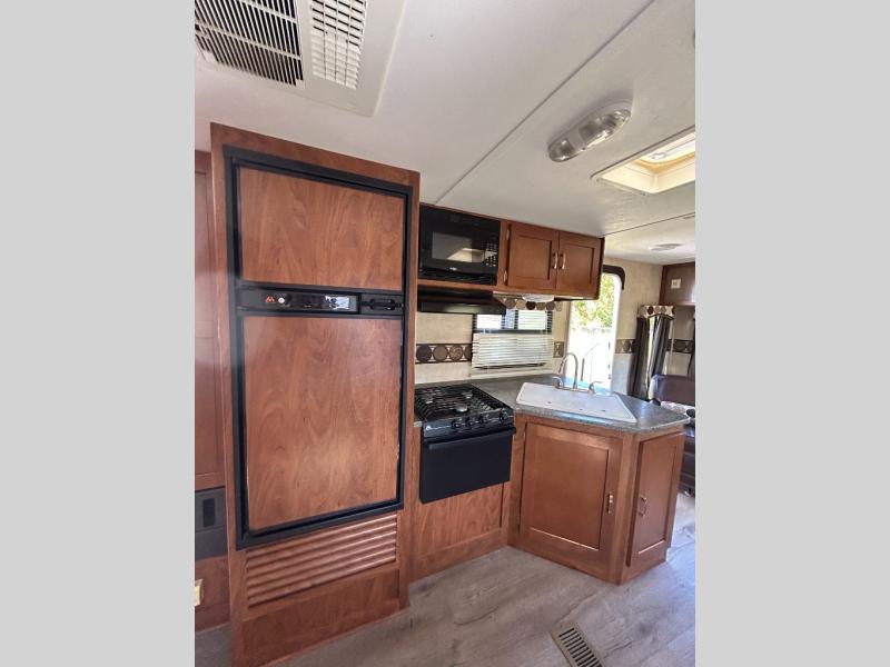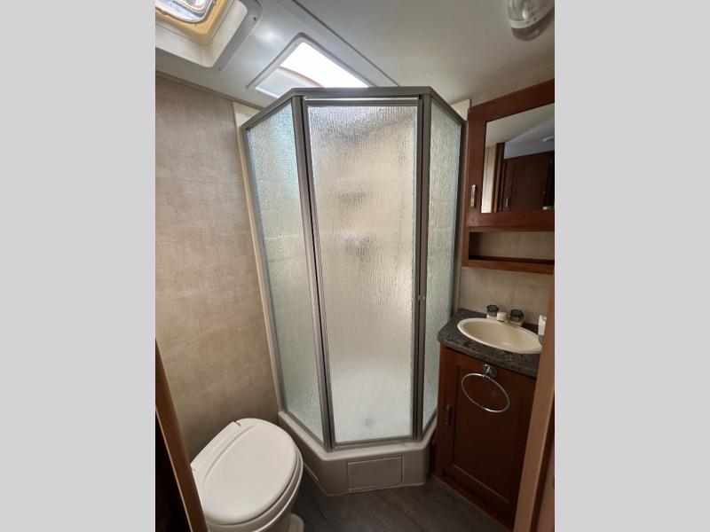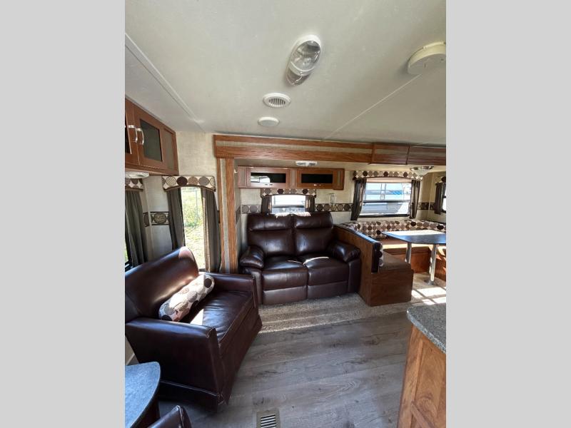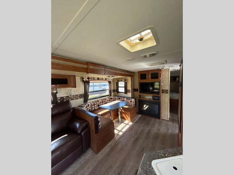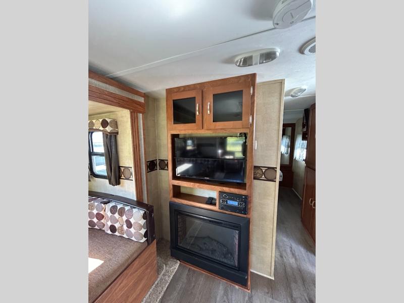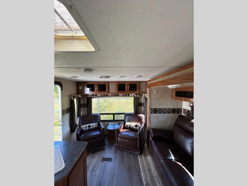 Enter the rear most entry door where you will find two chairs along the rear wall with an end table between, and overhead cabinet. A fold-down sofa with overhead storage, and u-shaped dinette slide creates a wider interior to enjoy. There is a entertainment center on the interior living room wall that can easily be viewed by any of the seating in the room.
