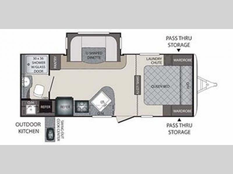 Outside enjoy the pass-through storage compartment up front for all of your exterior camping gear and more. There is a rear outdoor kitchen that features and refrigerator, sink, and swing-out cook center with two burner stove, and so much more!