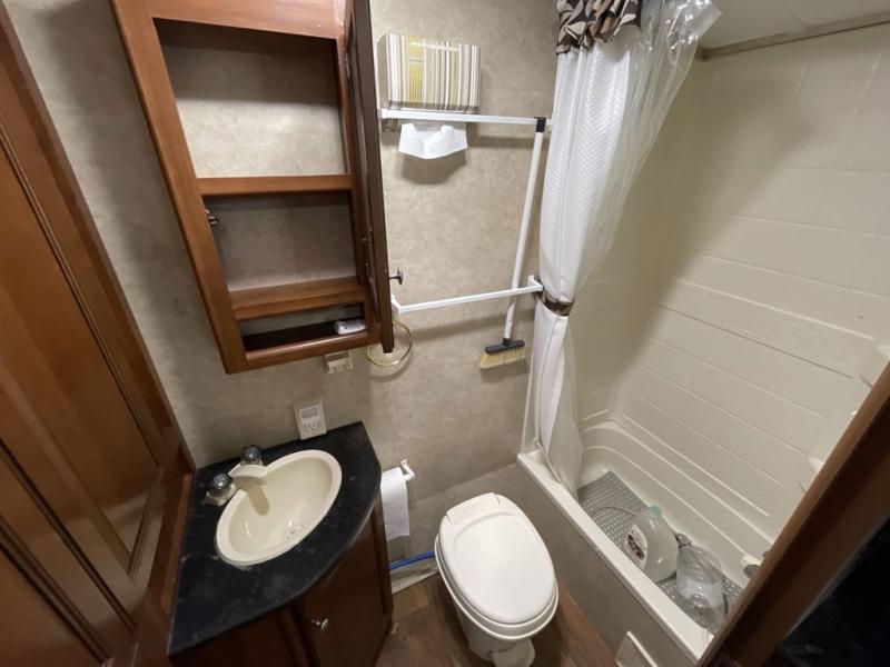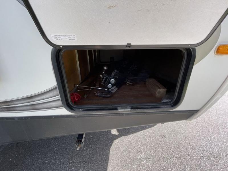 Outside enjoy the pass-through storage compartment up front for all of your exterior camping gear and more. There is a rear outdoor kitchen that features and refrigerator, sink, and swing-out cook center with two burner stove, and so much more!