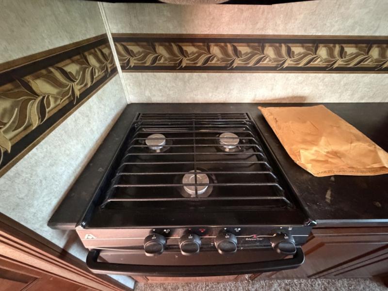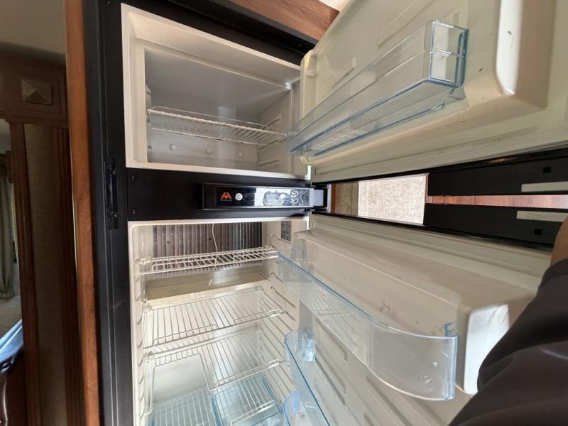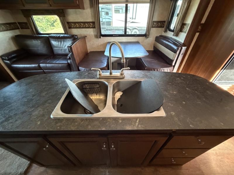 On the opposite side you will find a tri-fold sofa and booth dinette slide. The refrigerator is located just off the slide near the booth dinette. There is also a convenient island in the middle that features a double kitchen sink.