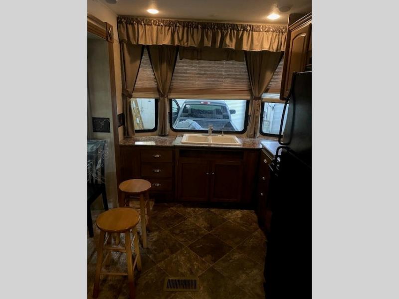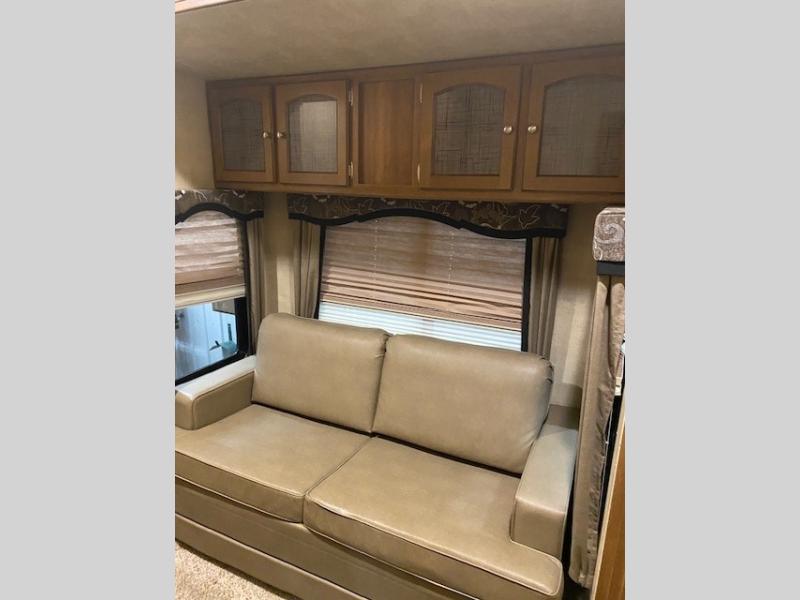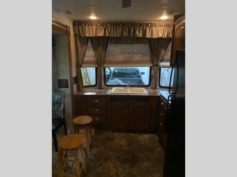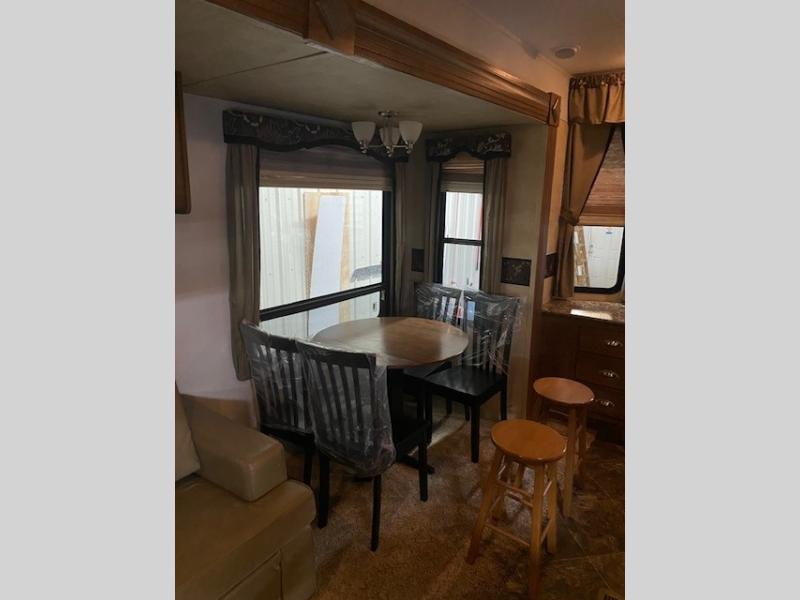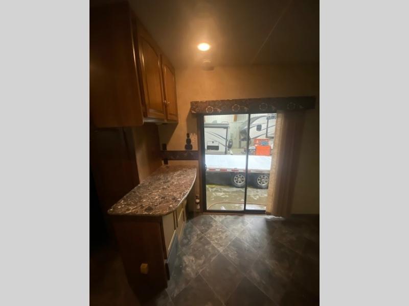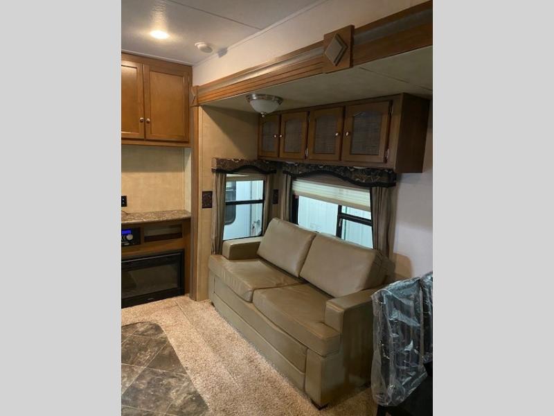 You will enjoy a free standing dinette and air bed sofa slide-out for plenty of seating to enjoy the entertainment center and optional electric fireplace.