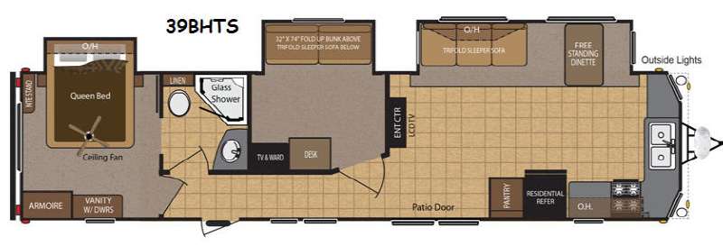 Enjoy eating your meals at a free standing dinette in the slide-out opposite the patio doors that also includes a tri-fold sofa sleeper with overhead storage. An entertainment center can be found along the interior living area wall featuring a flat screen LCD TV.