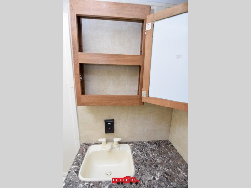 Outside enjoy a front pass-through compartment for all of your outdoor camping gear. And, in the rear the outside kitchen features a refrigerator, single sink, storage, and a two burner cook-top, plus so much more!