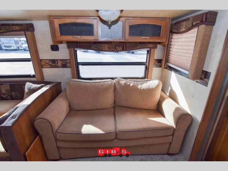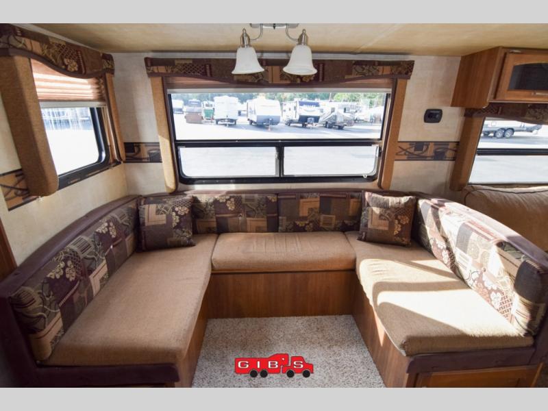 Just outside the bedroom door is an LCD TV for your enjoyment. Nearby is a slide out sofa with storage and a u-shaped dinette featuring plenty of seating for everyone during meals. The kitchen opposite features a large sink, three burner range, and refrigerator.
