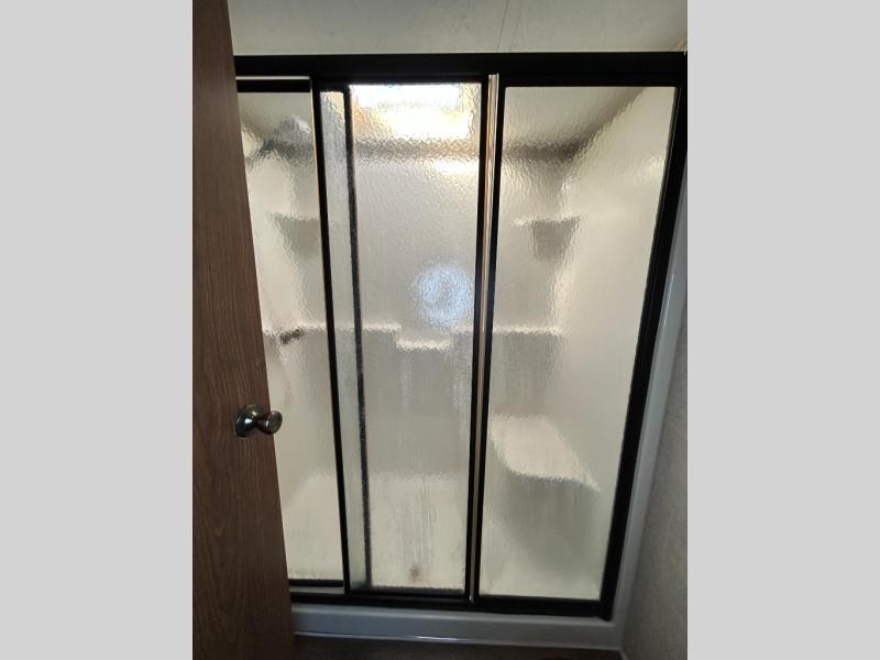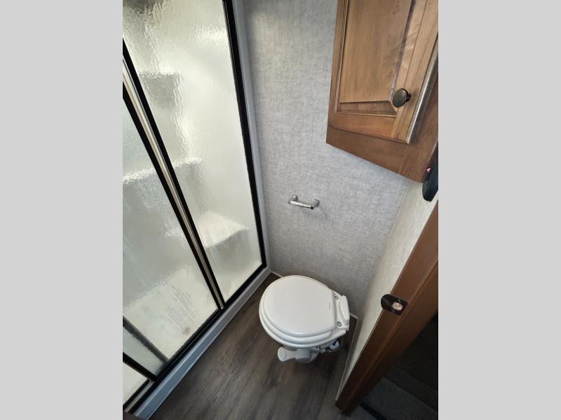 Step up to a side aisle bath and front bedroom. The bath features a residential shower, toilet, sink, and linen cabinet.