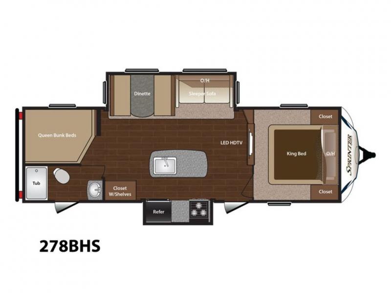 Keystone Sprinter travel trailer model 278BHS features a wider body design at 100", queen bed bunks, double slide-outs, two entry doors, plus a king bed!