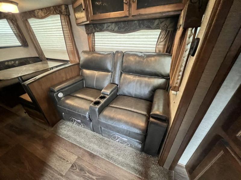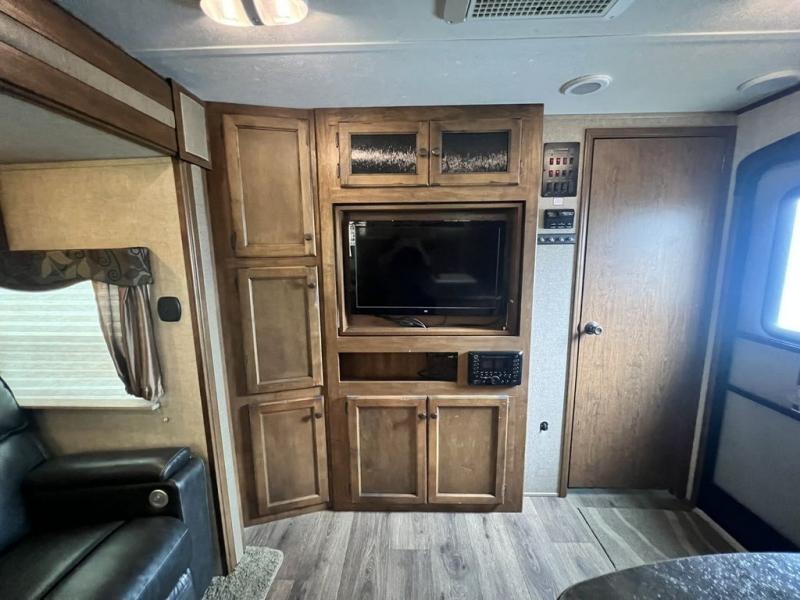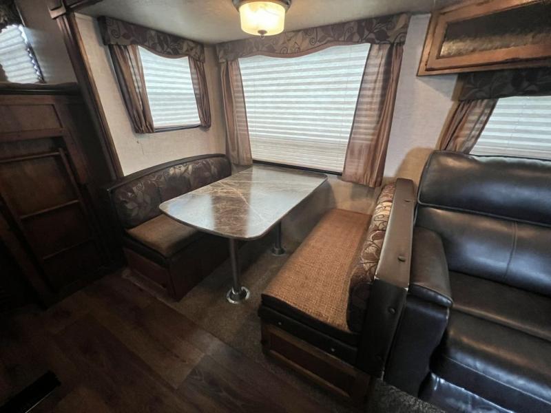 On the opposite side of the room there is a sofa sleeper and booth dinette slide. The sofa has overhead cabinets above and is perfect for additional sleeping space if needed. There is also an LED HDTV off to the side that is viewable from any of the seating in the space. There is also a set of cabinets to the side of the TV as well as above and below for more storage too.