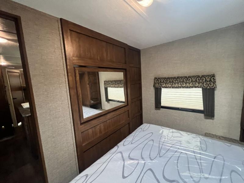 As you step inside you are greeted by a wide open concept living space with a front bedroom featuring a king size bed. There are also closets on both sides of the bed along with an overhead cabinet for more storage above.