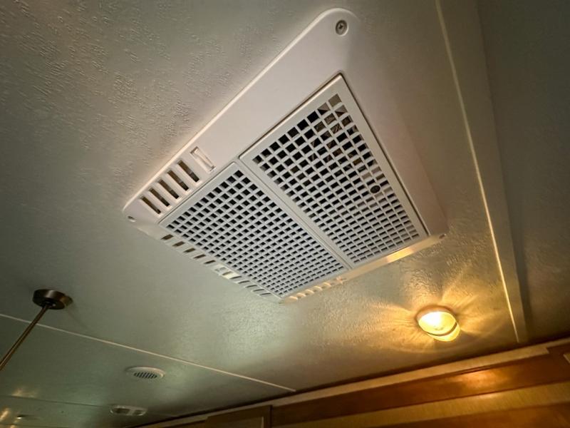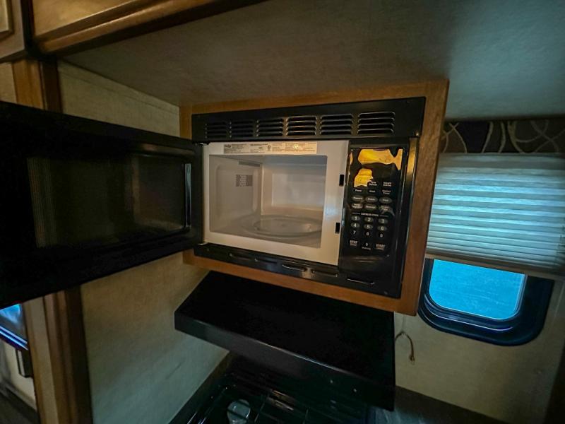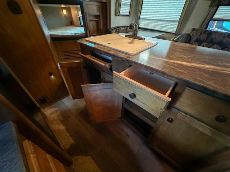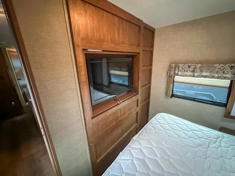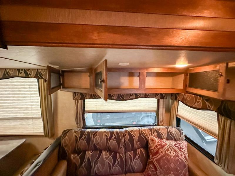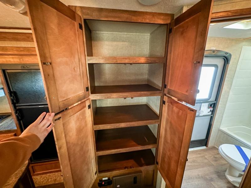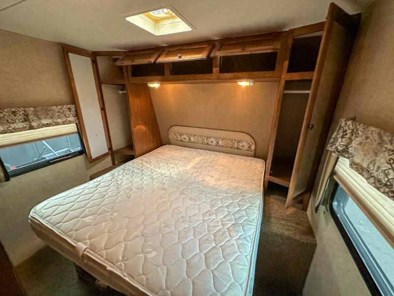 As you step inside you are greeted by a wide open concept living space with a front bedroom featuring a king size bed. There are also closets on both sides of the bed along with an overhead cabinet for more storage above.