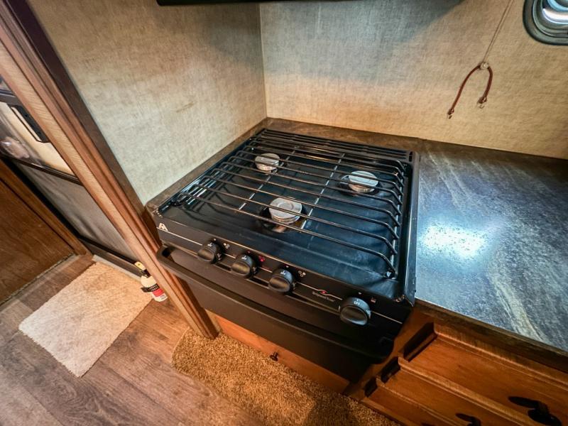 The combined living and kitchen areas have dual slides opposite one another with the slide closest to the door featuring a three burner range and refrigerator. There is a closet with shelves nearby. The kitchen island provides additional counter space and also holds the kitchen sink.