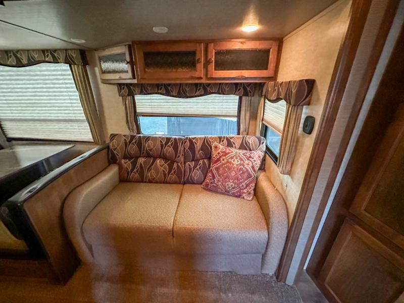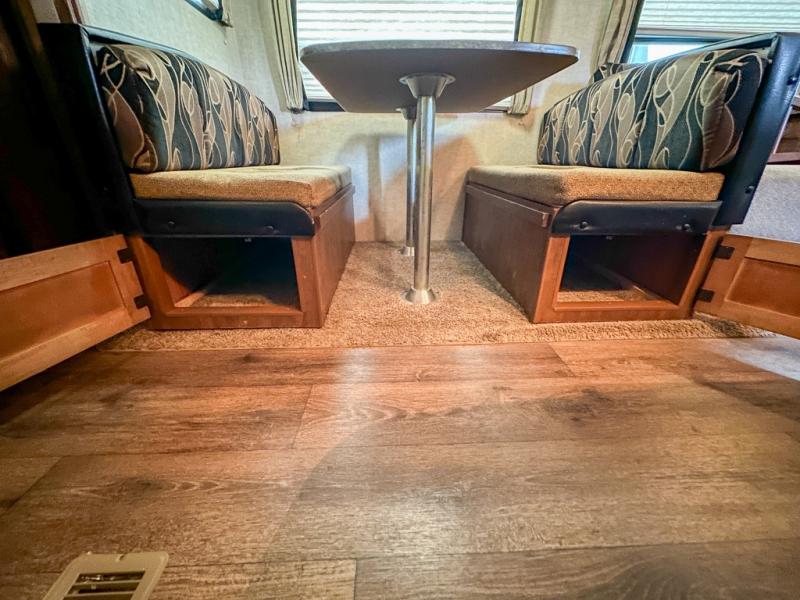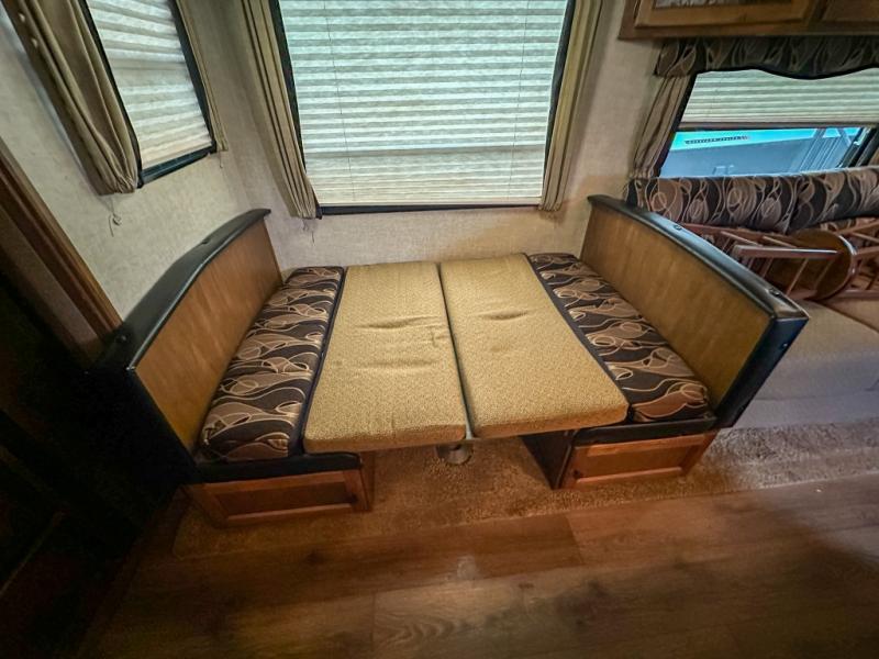 On the opposite side of the room there is a sofa sleeper and booth dinette slide. The sofa has overhead cabinets above and is perfect for additional sleeping space if needed. There is also an LED HDTV off to the side that is viewable from any of the seating in the space. There is also a set of cabinets to the side of the TV as well as above and below for more storage too.