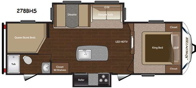 Keystone Sprinter travel trailer model 278BHS features a wider body design at 100", queen bed bunks, double slide-outs, two entry doors, plus a king bed!