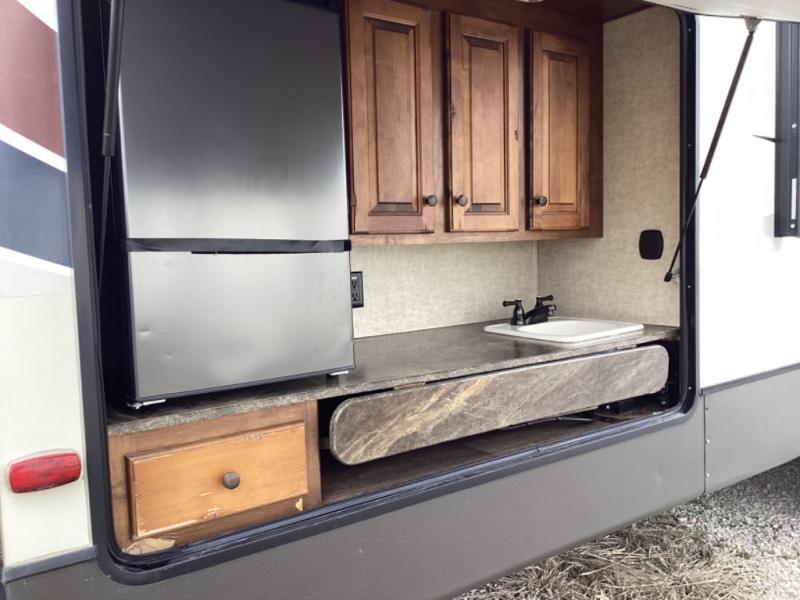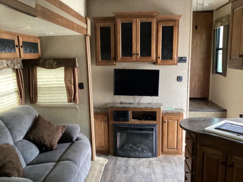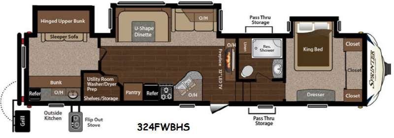 Keystone's Sprinter 324FWBHS fifth wheel with its wide body design has enough space for everyone with a bunkhouse that the kids will love, a spacious living room with large slide, fireplace, and king size bed. There is even an outdoor kitchen for added convenience, and a utility room that has been prepped for a washer and dryer!