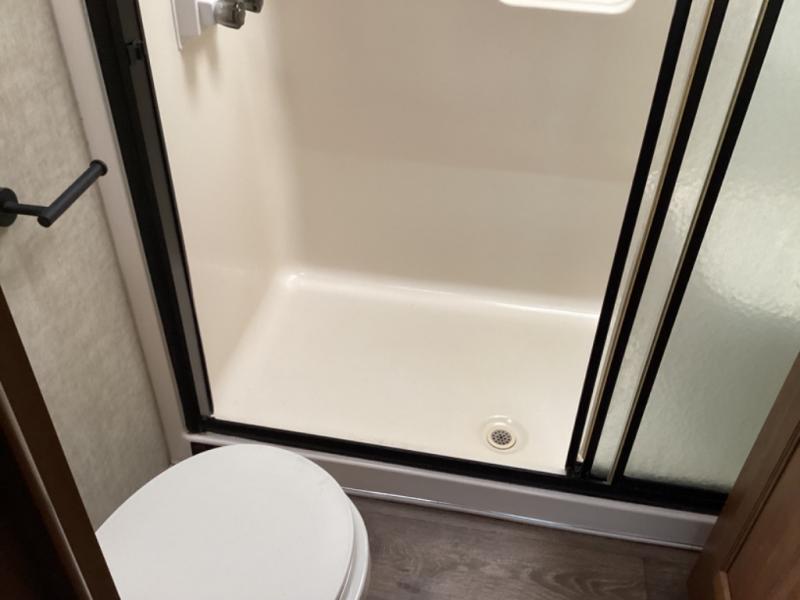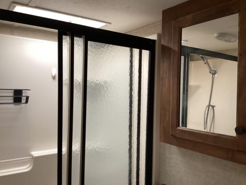 Heading back up front you will find a side aisle bath at the top of the stairs featuring a residential shower, toilet, sink, and linen cabinet with pass-thru storage below.