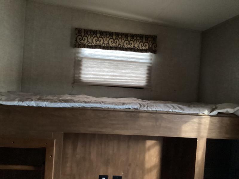 The rear bunkhouse features a sleeper sofa slide with hinged upper bunk on one end, and a bunk over an exterior kitchen on the opposite side.
