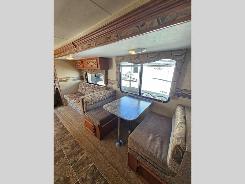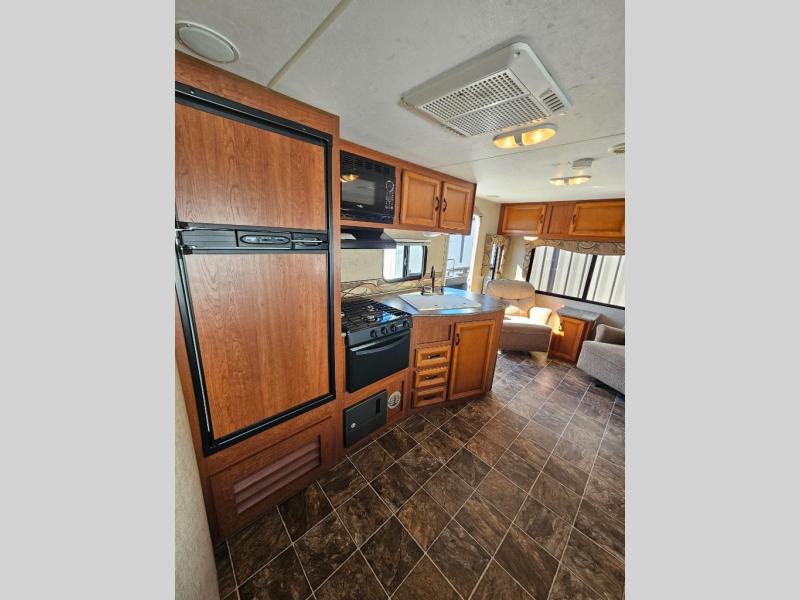 As you enter the rear entrance, there are two lounge chairs along the rear wall. The slide has a sofa and dinette. Next to the dinette you will find a TV outlet/closet. The opposite side of the travel trailer has a double kitchen sink, three burner range, microwave, and refrigerator.