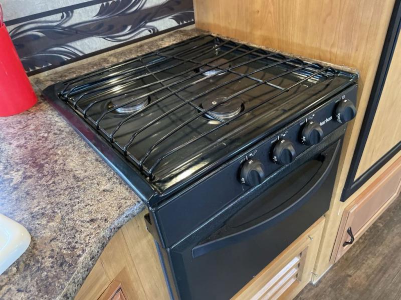 The kitchen offers a double kitchen sink, three burner range, refrigerator and a closet. On the opposite side of the trailer is a slide with a sofa and dinette. You can relax on the sofa or at the dinette and enjoy the entertainment center.
