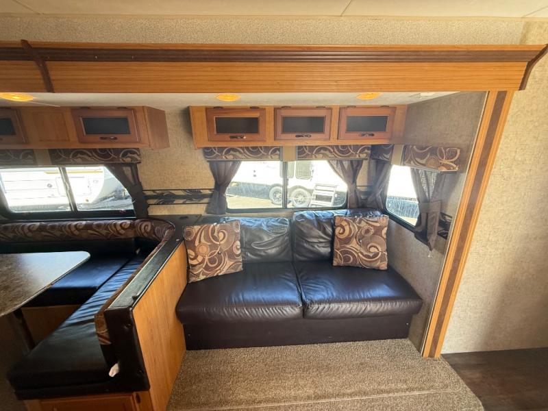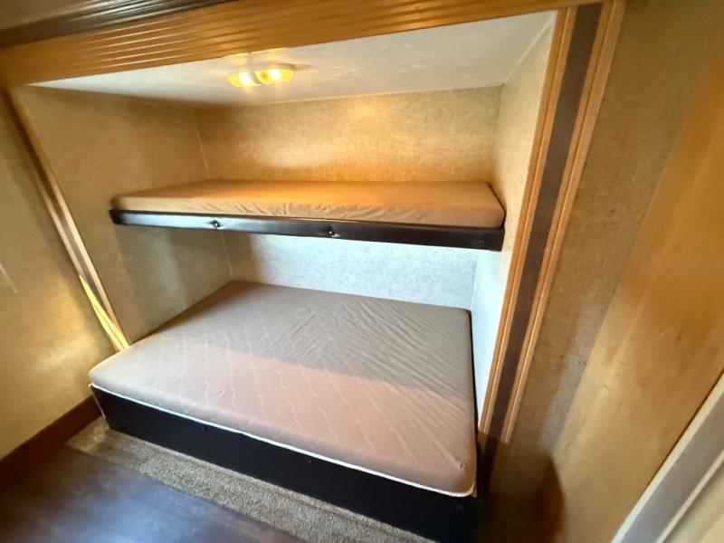 The rear of the trailer offers a bunk house. You will find a slide with a sofa and a bunk above the sofa. On the opposite side there is a bunk and closet.