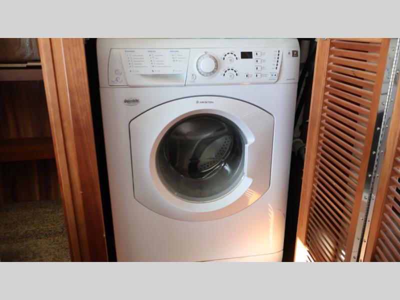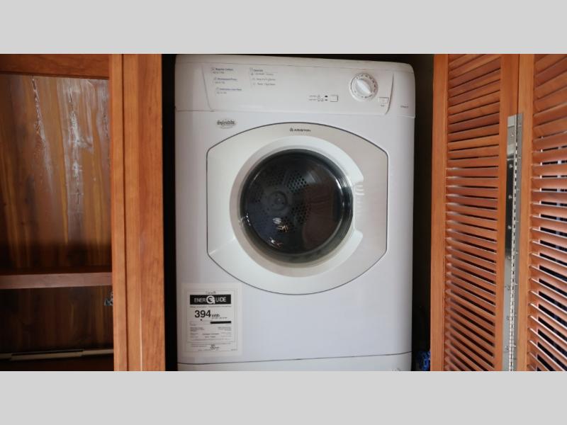 Continue on past the bath to a spacious front bedroom with queen bed slide-out including nightstands on both sides of the bed. There is a wardrobe with sliding doors, window seat, and dresser with overhead storage cabinet. There is a second wardrobe or an optional two piece washer and dryer for your convenience.