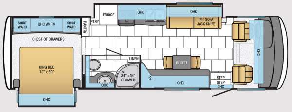 There are plenty of overhead cabinets throughout the motor home which provide much storage.