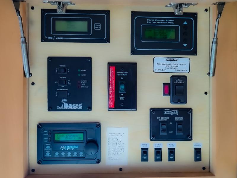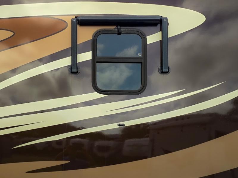 The bedroom offers a king bed slide. In the rear of the motor home, you will find the master bath. The bath has a wardrobe, two sinks, wardrobe, toilet, and shower. The full wall slide has two wardrobes, a chest of drawers, overhead TV, pantry, refrigerator, hide-a-leaf dinette, and hide-a-bed sofa.