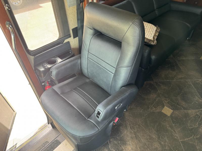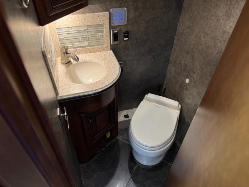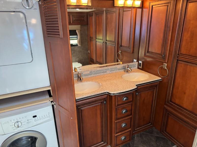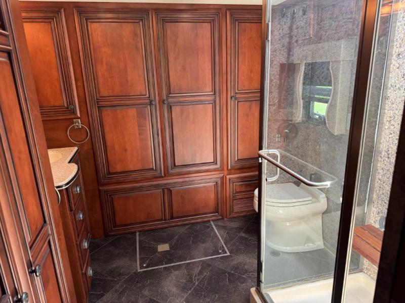 The bedroom offers a king bed slide. In the rear of the motor home, you will find the master bath. The bath has a wardrobe, two sinks, wardrobe, toilet, and shower. The full wall slide has two wardrobes, a chest of drawers, overhead TV, pantry, refrigerator, hide-a-leaf dinette, and hide-a-bed sofa.