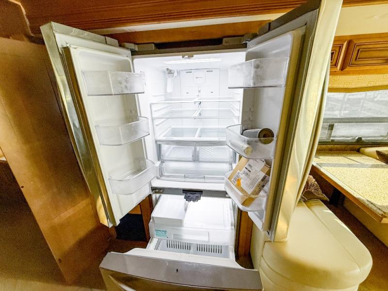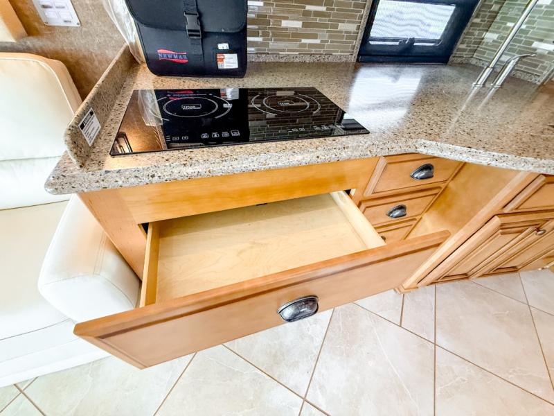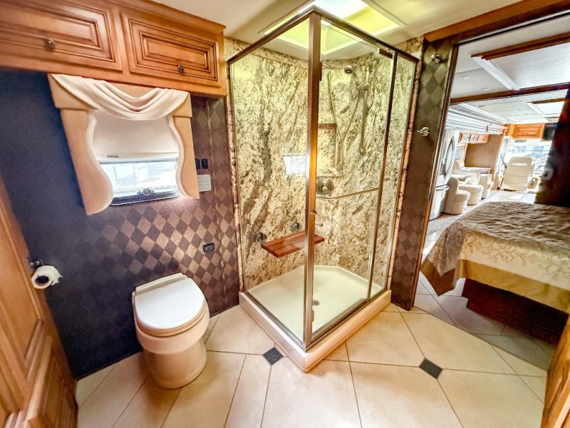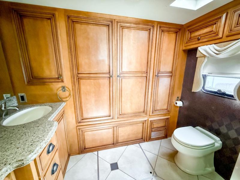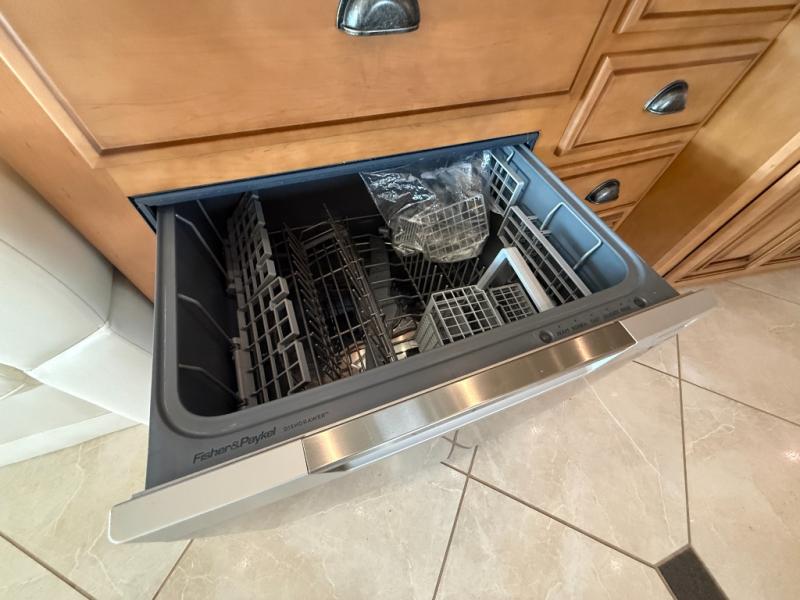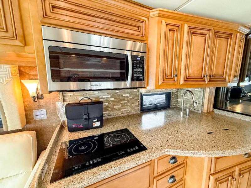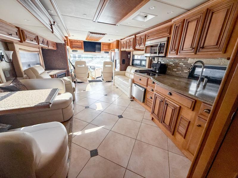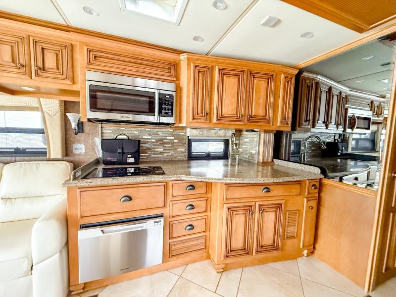 The fully equipped kitchen is designed for culinary enthusiasts, offering expansive counter space, induction or gas cooktop, convection microwave, and residential-style cabinetry. Whether preparing quick meals or hosting guests, this coach provides the space and functionality you expect from a luxury motorhome.