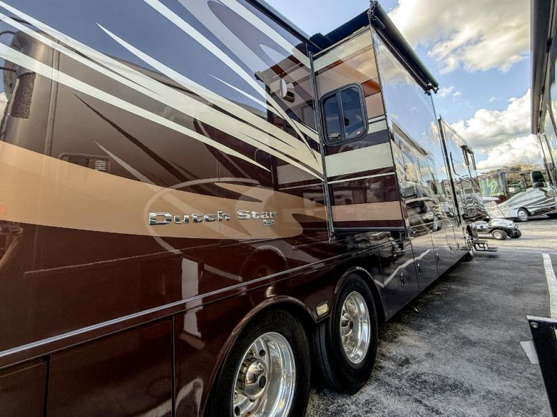 The Dutch Star 4369 boasts full-body paint with striking graphics and pass-through basement storage with slide-out trays. An automatic patio awning and exterior entertainment center extend your living space outdoors, perfect for tailgating or relaxing under the stars.