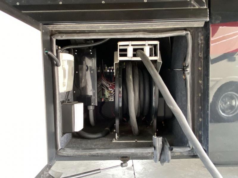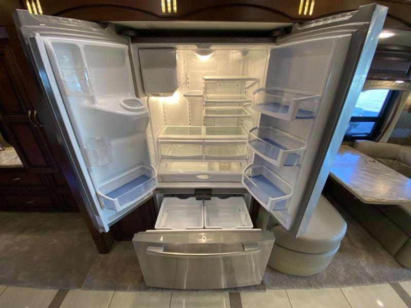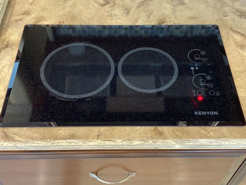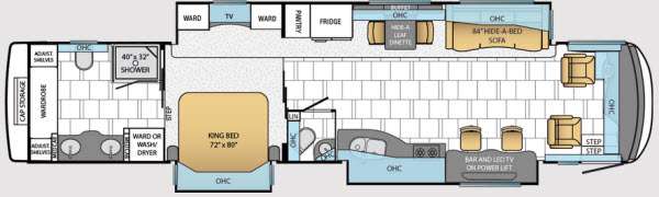 As you enter the motor home, to the left there is a slide with a bar and LED TV on power lift, two burner range, and a double kitchen sink. The other side has a full wall slide with a hide-a-bed sofa, hide-a-leaf dinette, refrigerator, pantry, two wardrobes, and an overhead TV.