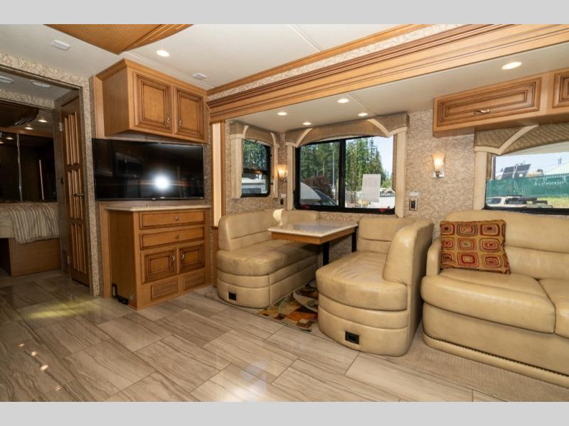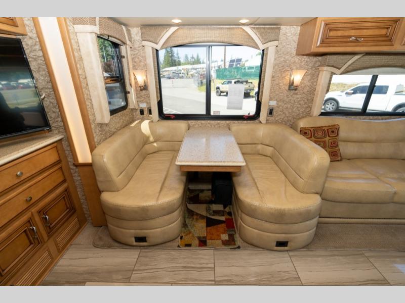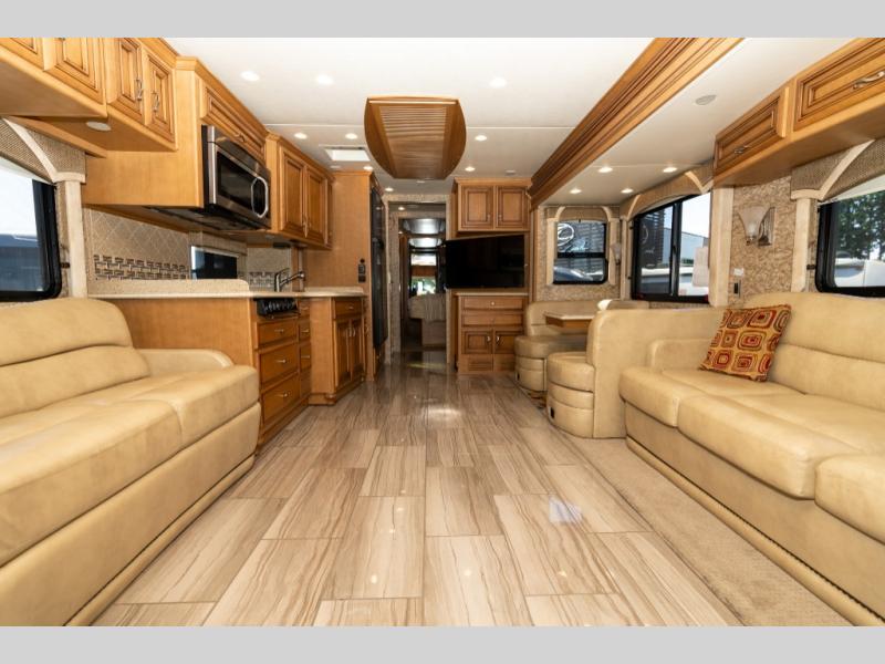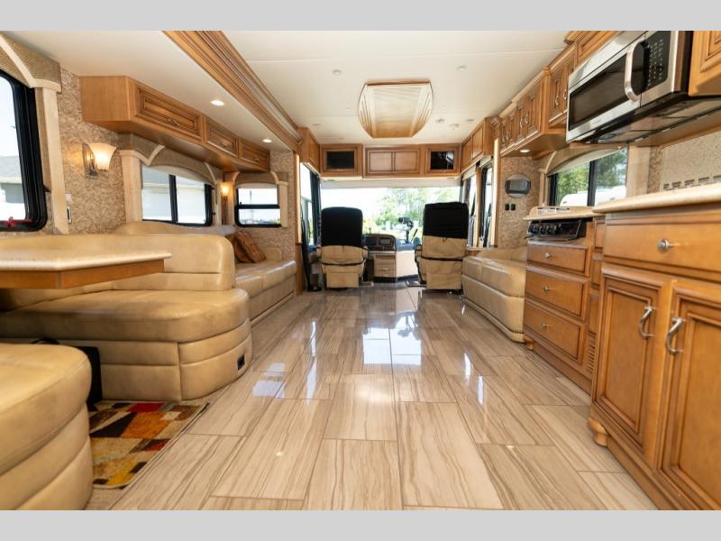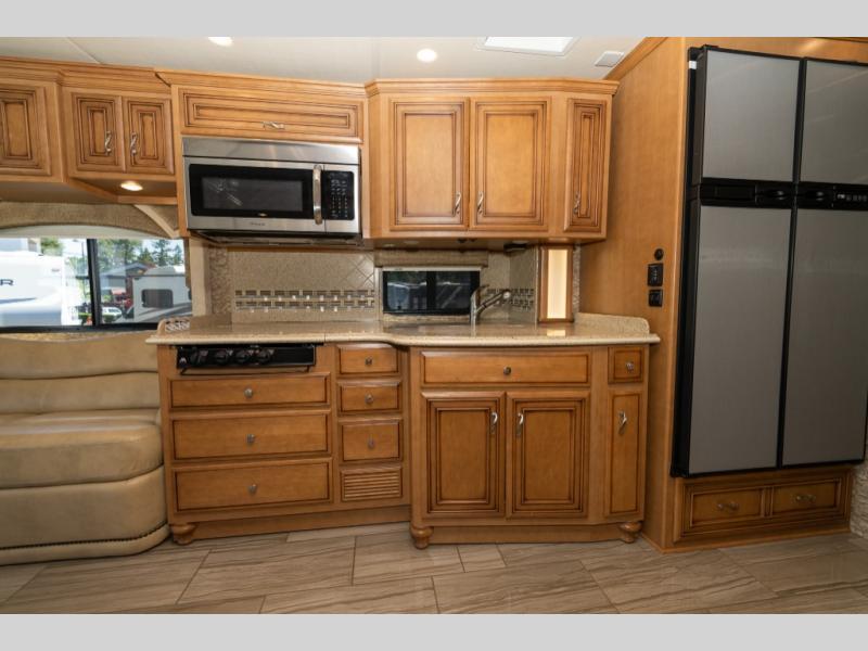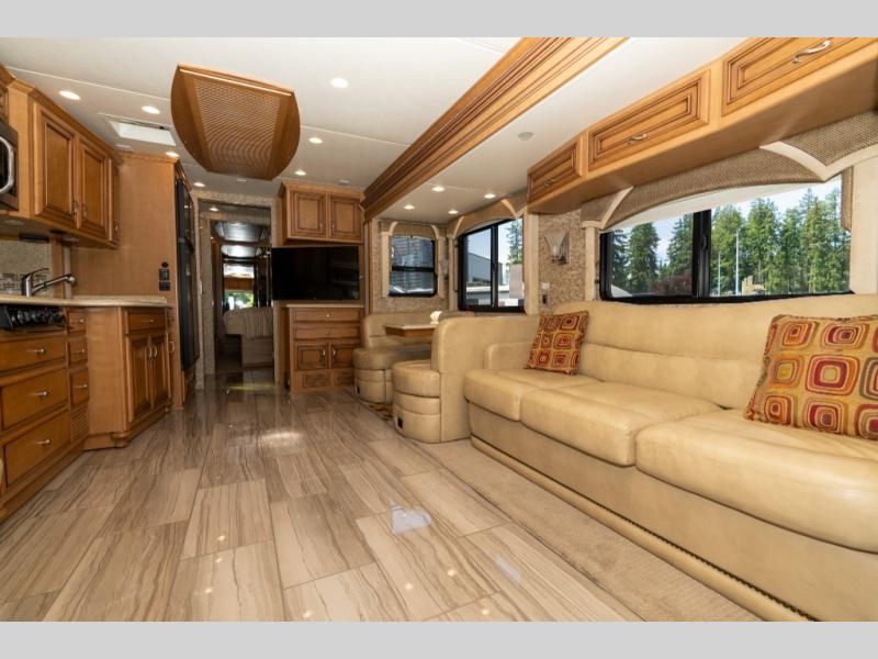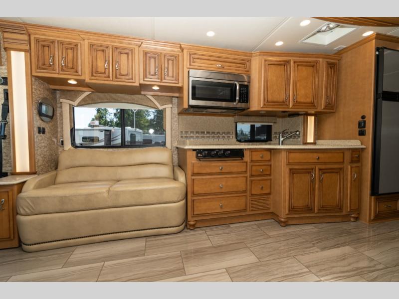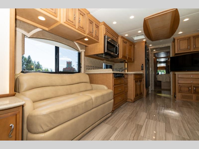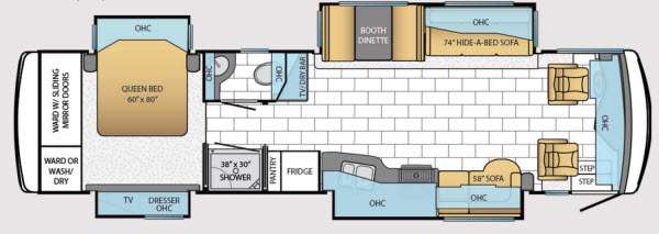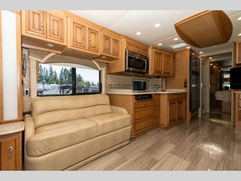 As you enter the motor home, to the left is a slide with a sofa, three burner range, and double kitchen sink. Next to the sink there is a refrigerator and pantry. The other side of the motor home has a slide with a sofa, and booth dinette. Next to the dinette is a TV and dry bar.