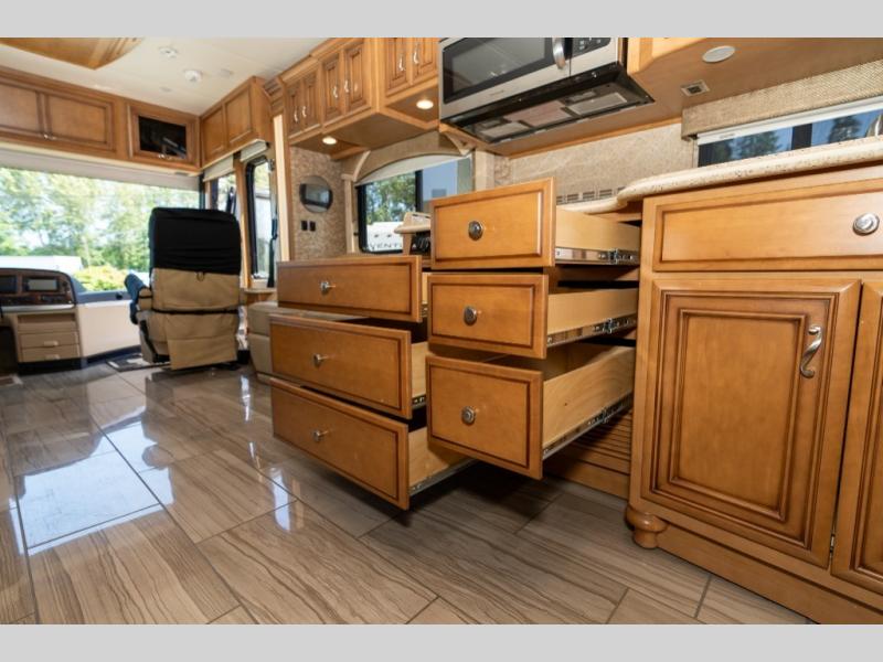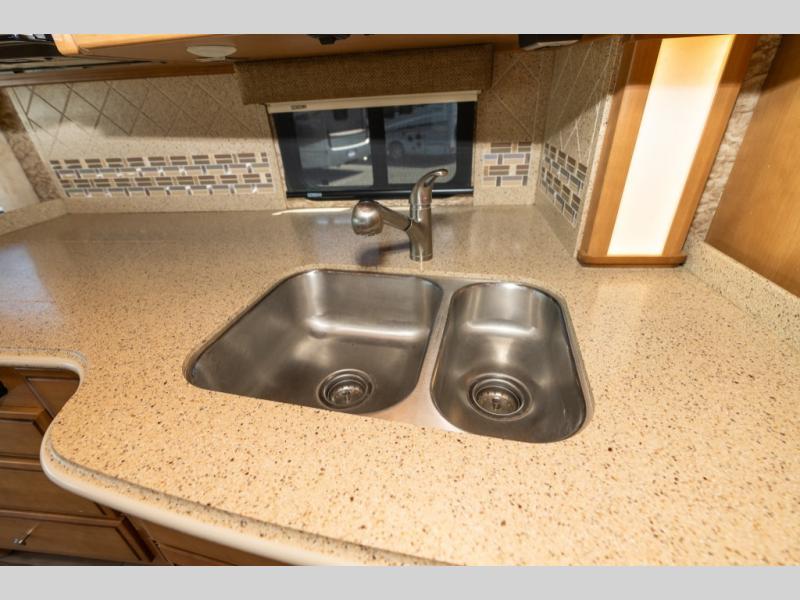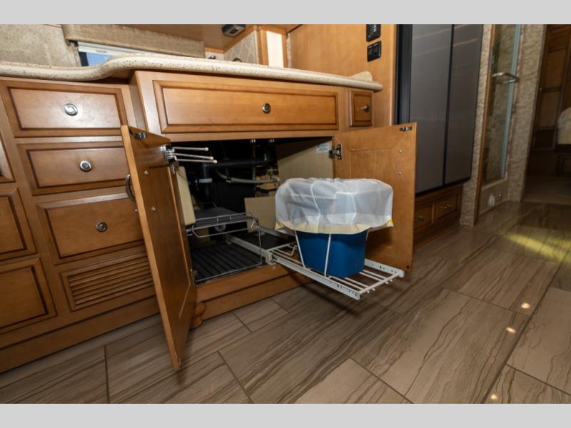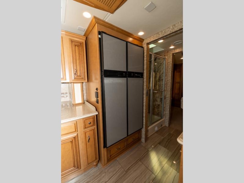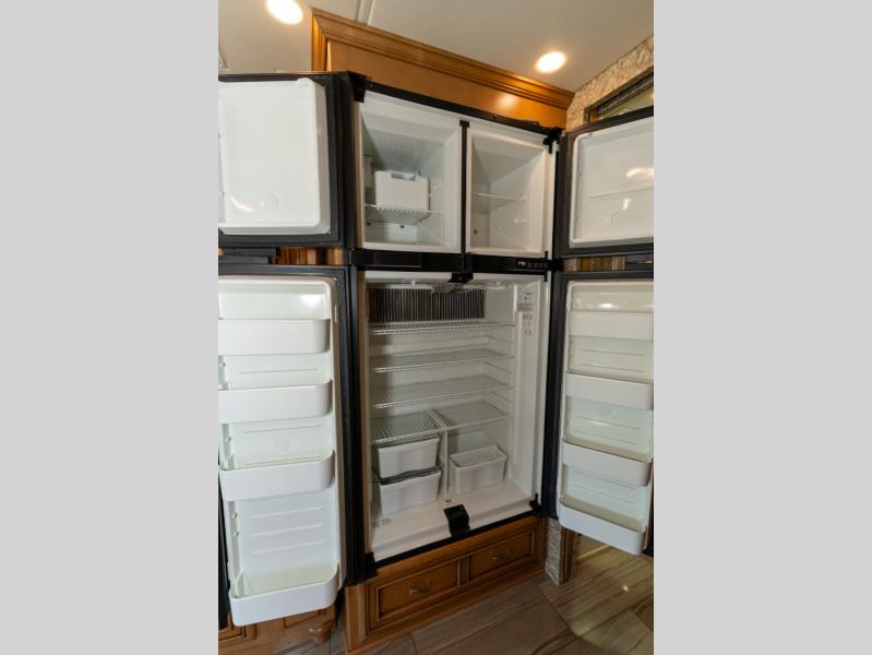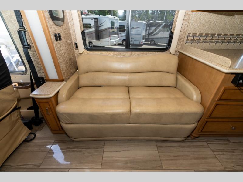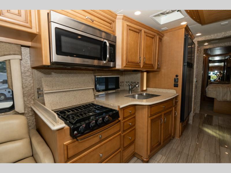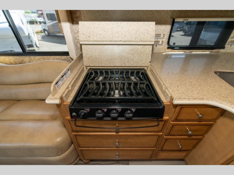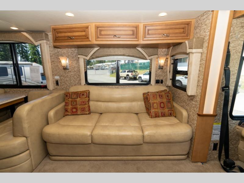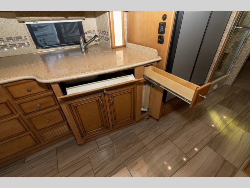 As you enter the motor home, to the left is a slide with a sofa, three burner range, and double kitchen sink. Next to the sink there is a refrigerator and pantry. The other side of the motor home has a slide with a sofa, and booth dinette. Next to the dinette is a TV and dry bar.