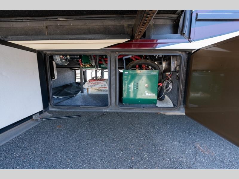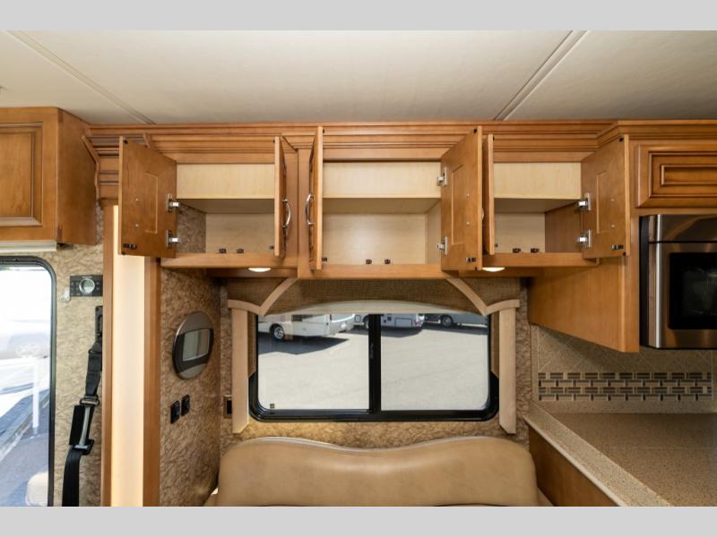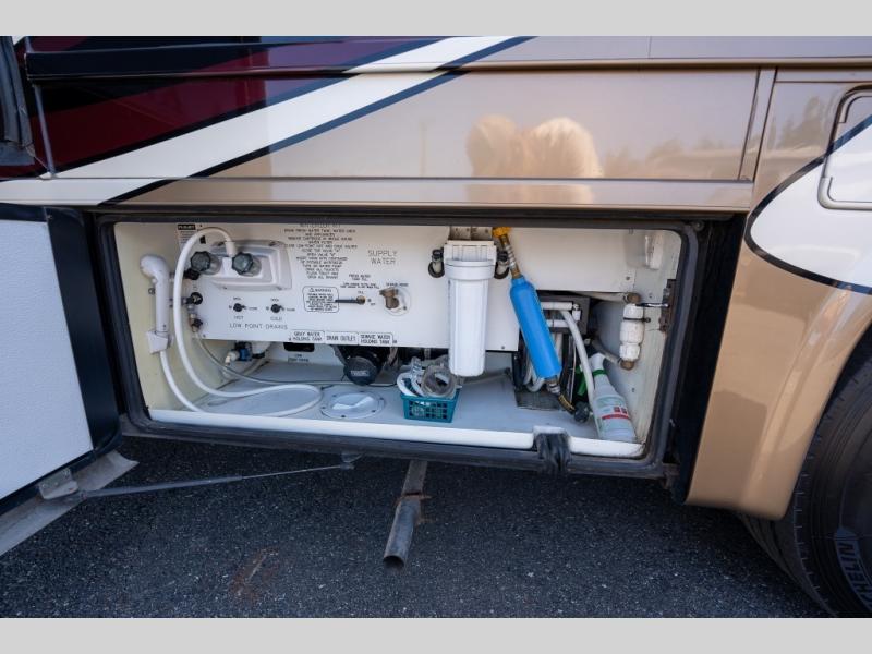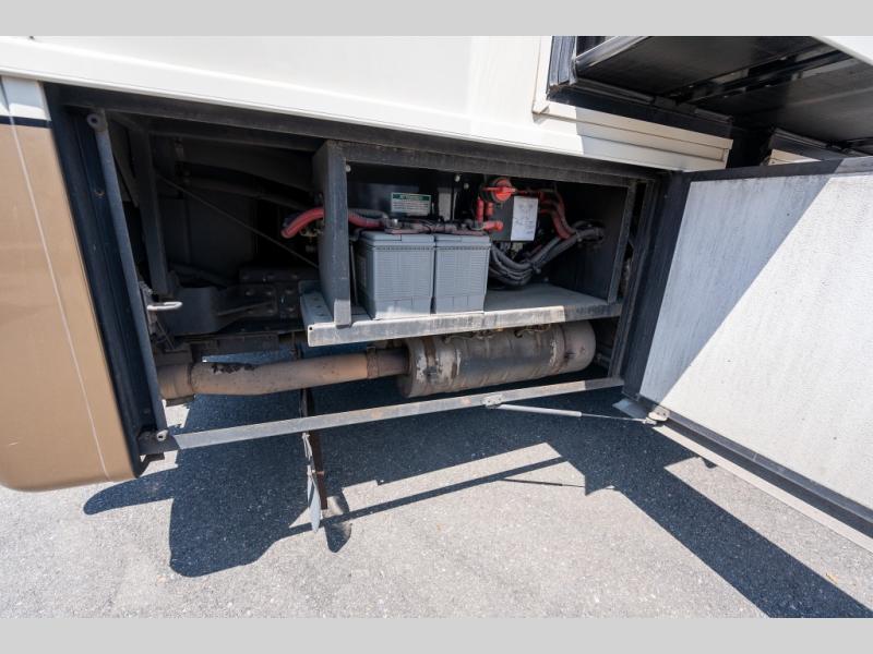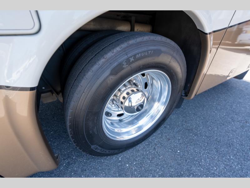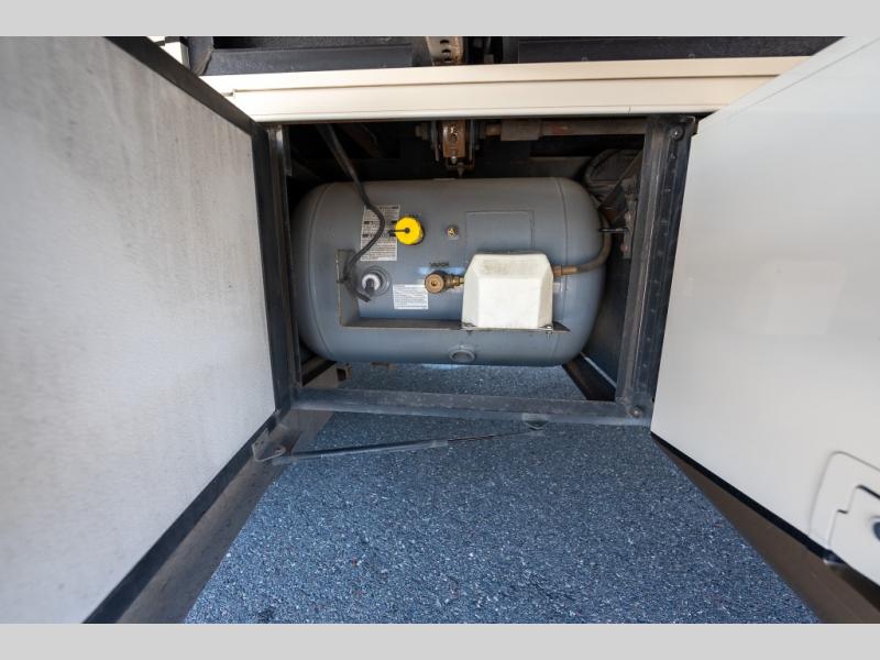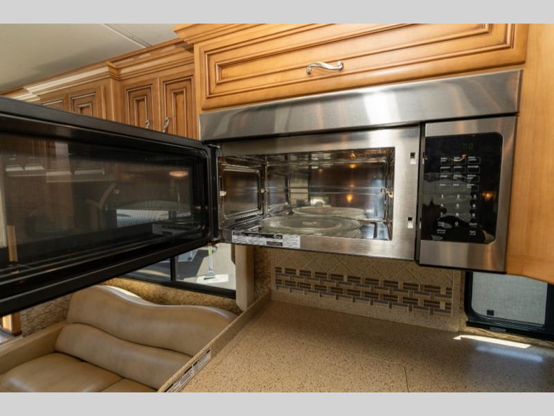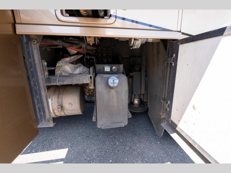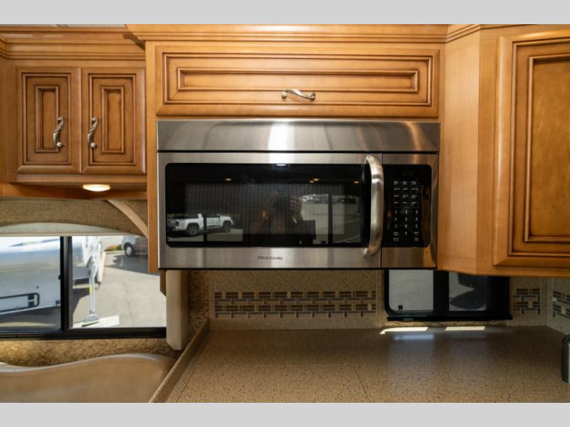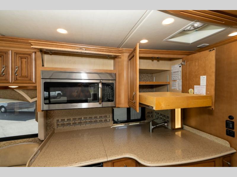 As you enter the motor home, to the left is a slide with a sofa, three burner range, and double kitchen sink. Next to the sink there is a refrigerator and pantry. The other side of the motor home has a slide with a sofa, and booth dinette. Next to the dinette is a TV and dry bar.