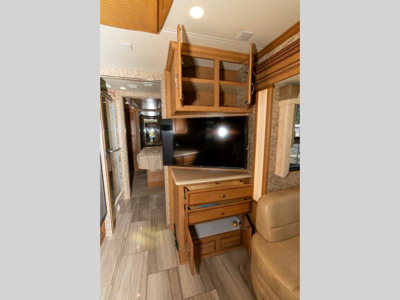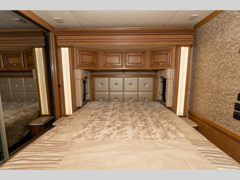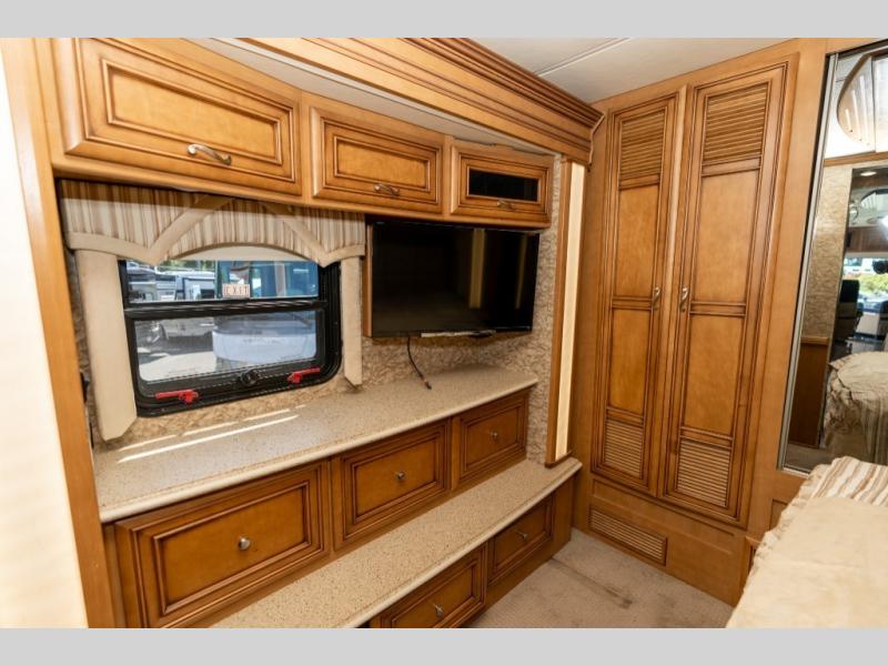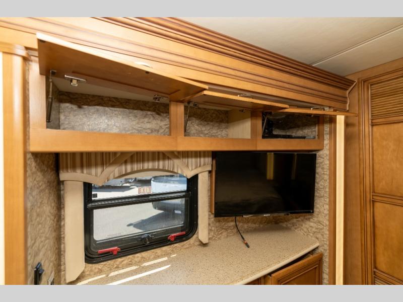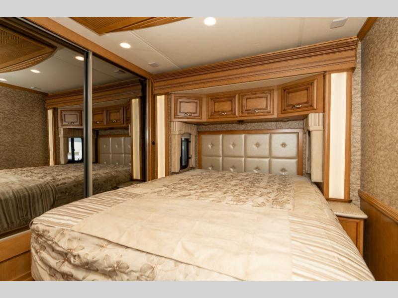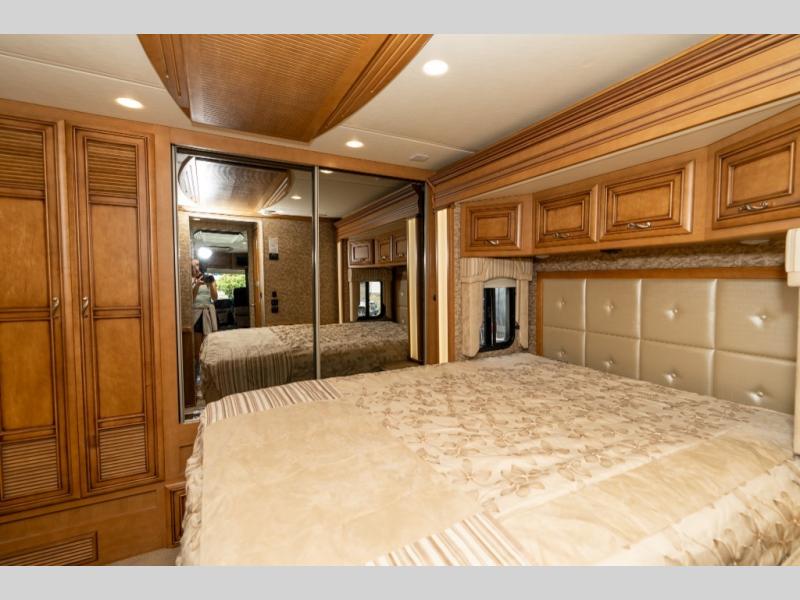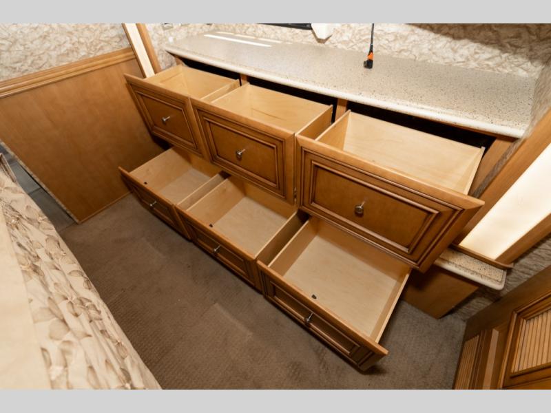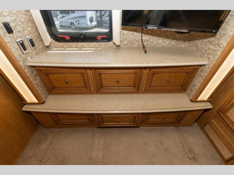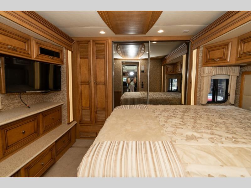 In the rear you will find the bedroom with two slides. One slide has a queen bed and the other slide has a TV and dresser. There is plenty of storage with the rear wardrobe.