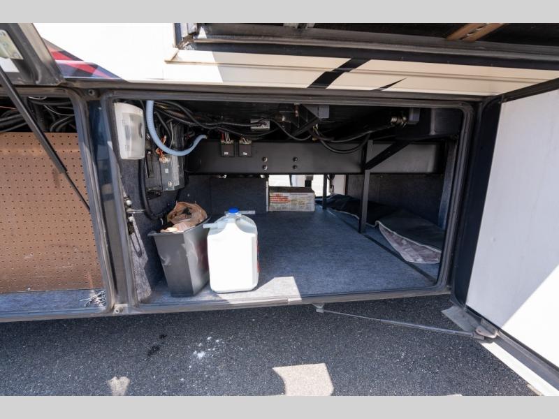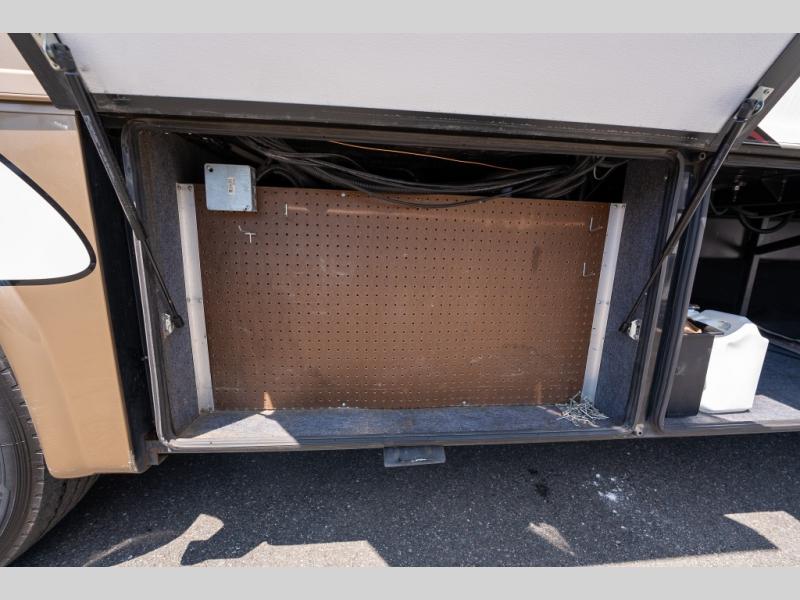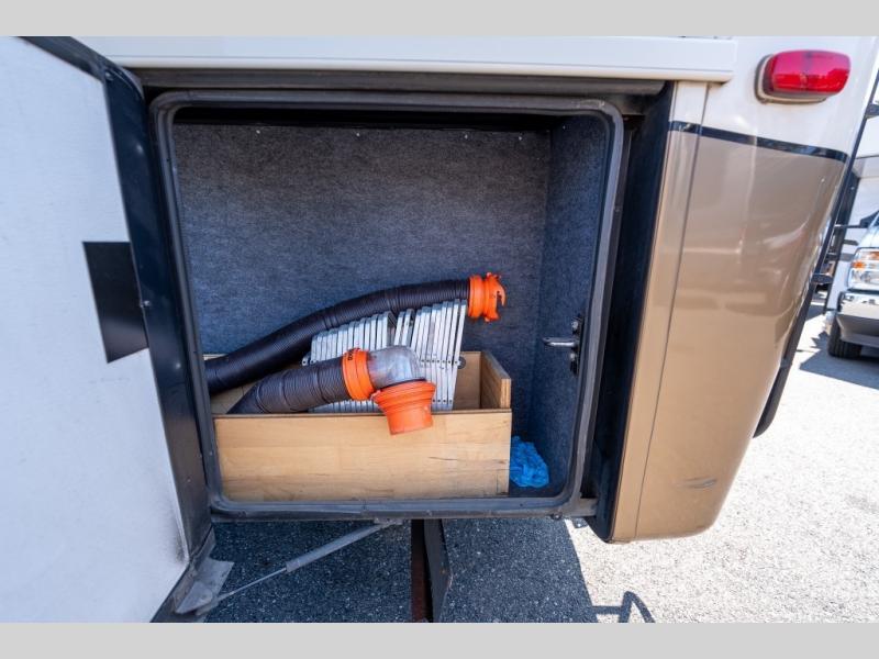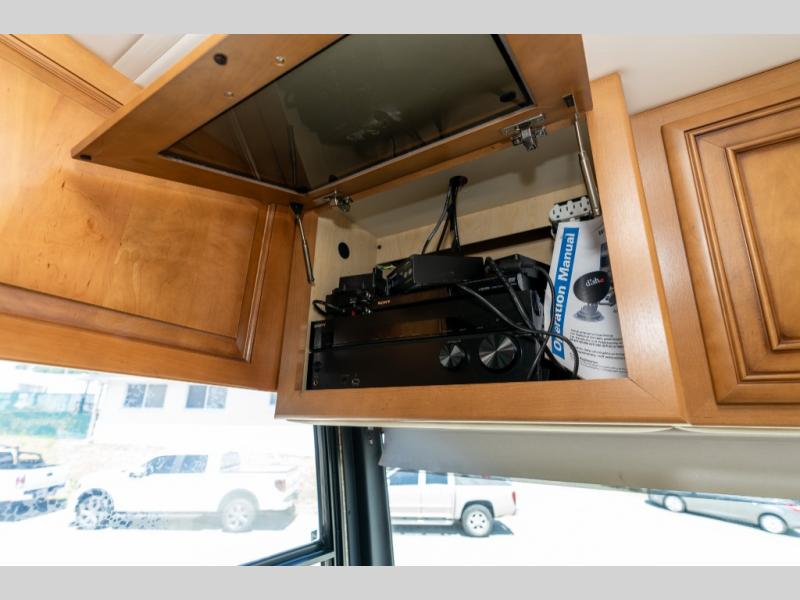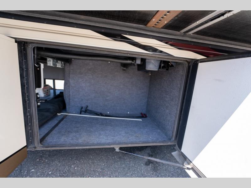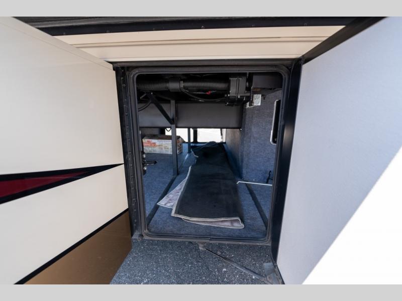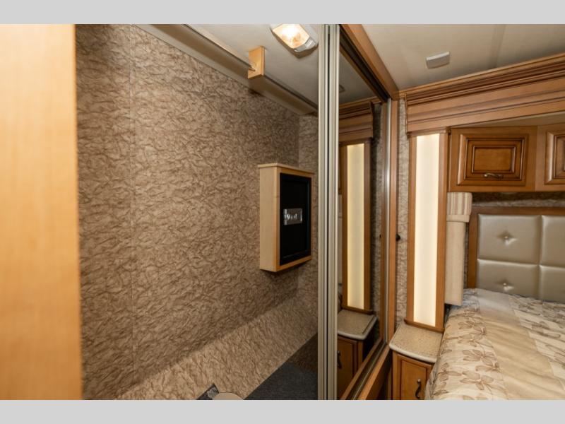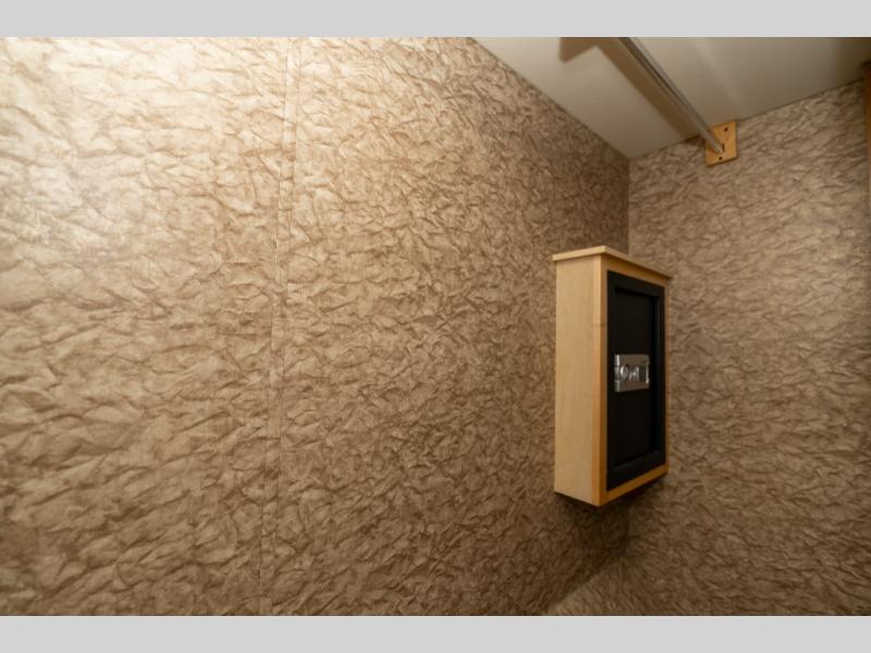 In the rear you will find the bedroom with two slides. One slide has a queen bed and the other slide has a TV and dresser. There is plenty of storage with the rear wardrobe.