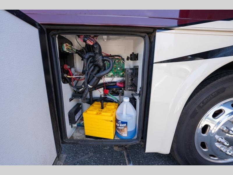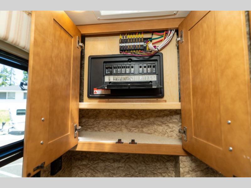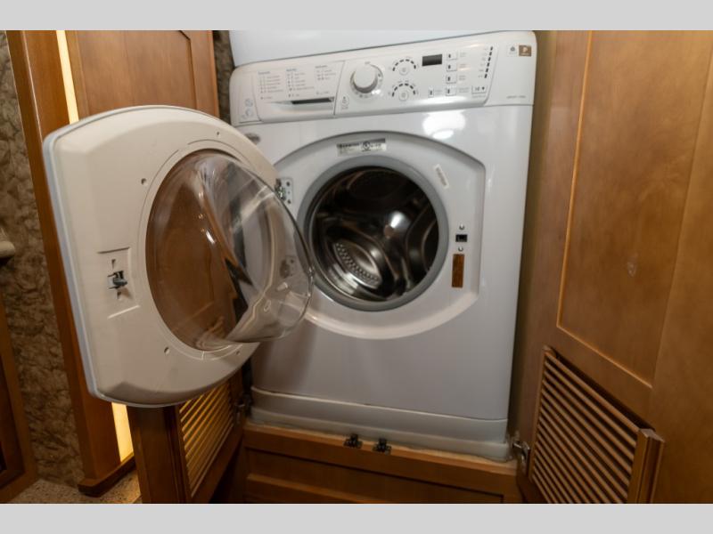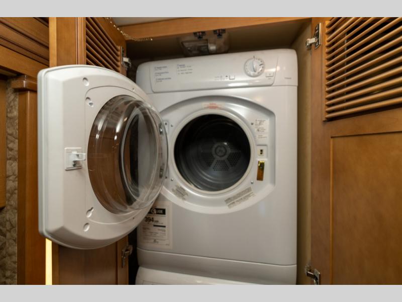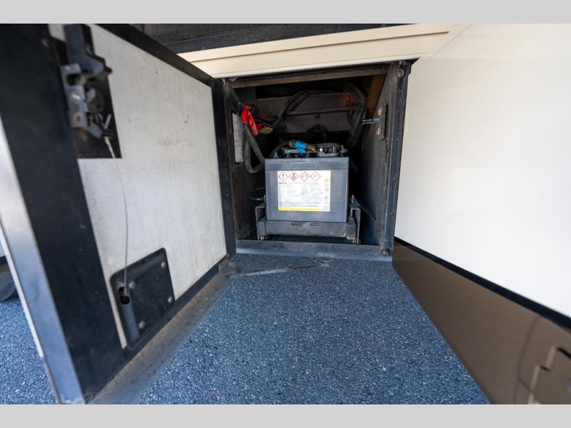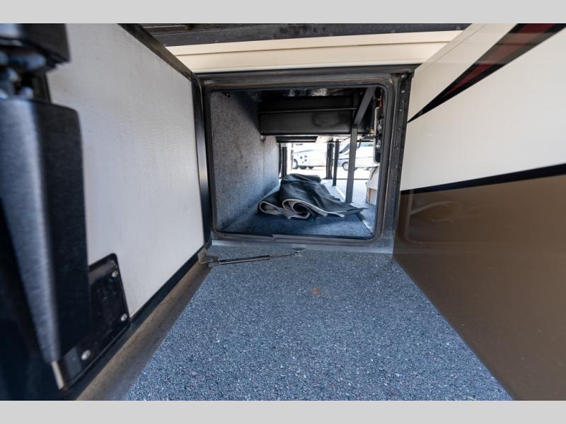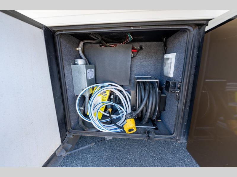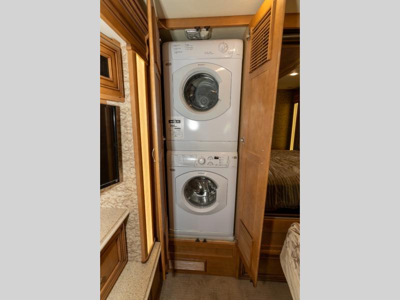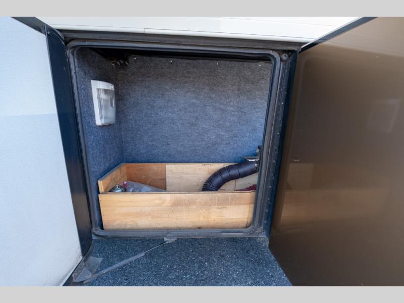 In the rear you will find the bedroom with two slides. One slide has a queen bed and the other slide has a TV and dresser. There is plenty of storage with the rear wardrobe.