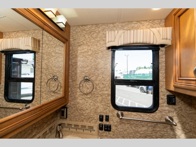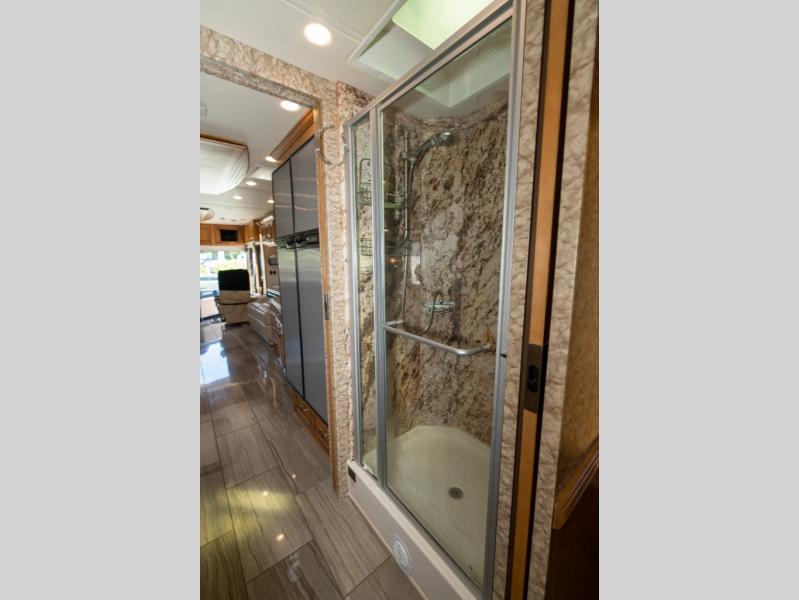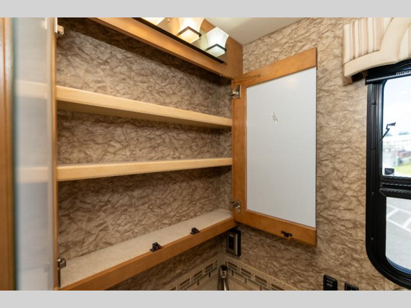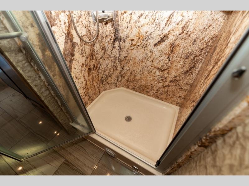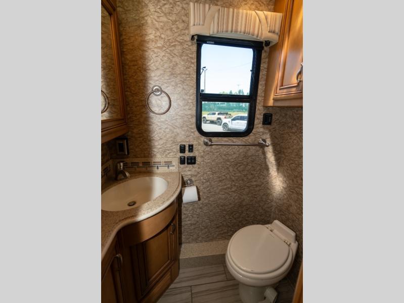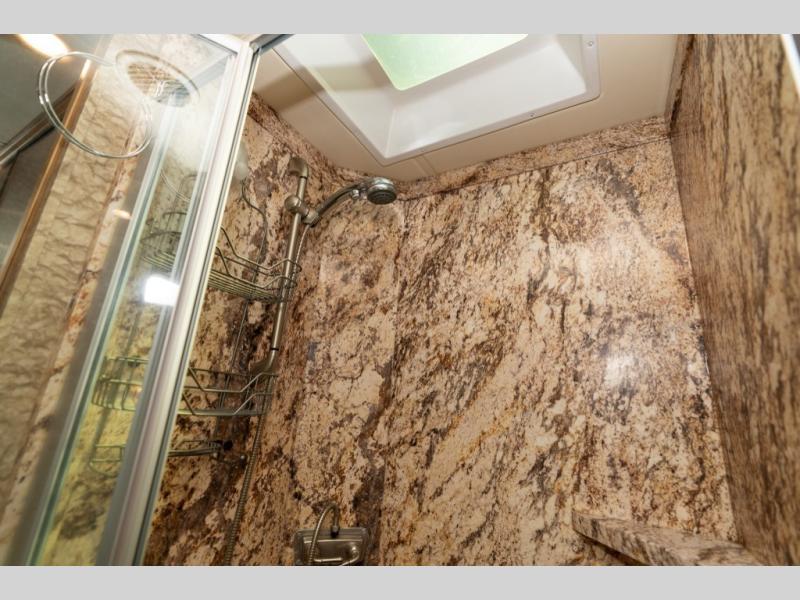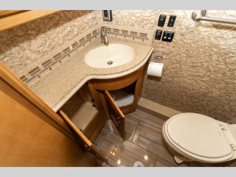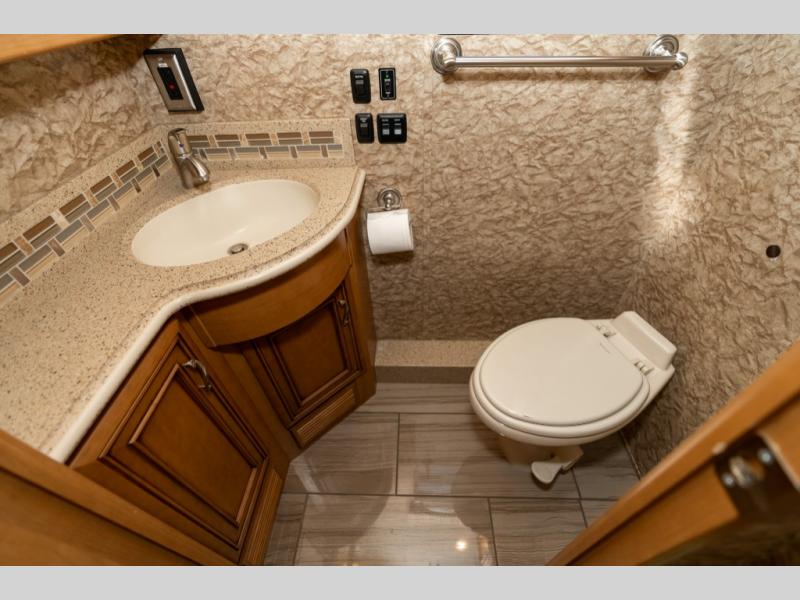 The bathroom offers a private toilet area with sink on one side of the motor home and a shower on the other side.