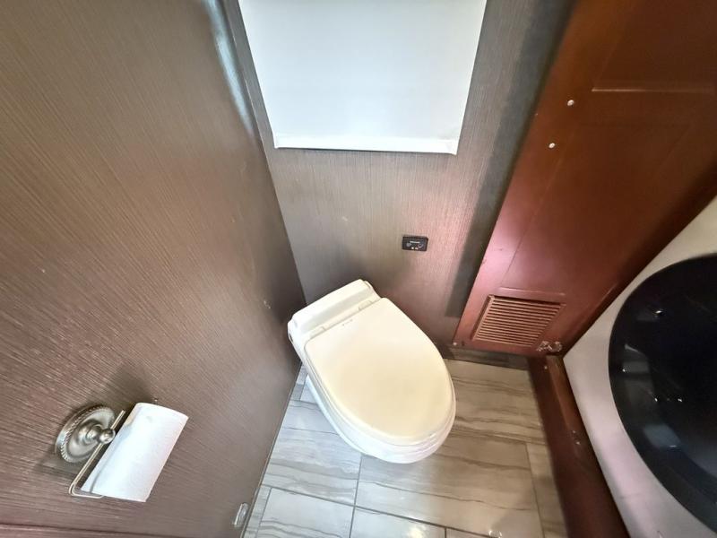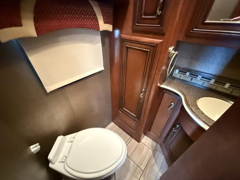 The half bath is down the hall. The rear bedroom has a king bed slide. The master bath offers a toilet, sink, wardrobe, and corner shower. There is a full wall slide with two wardrobes, a chest of drawers, overhead TV, pantry, refrigerator, booth dinette, and hide-a-bed sofa.