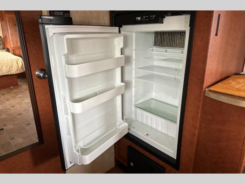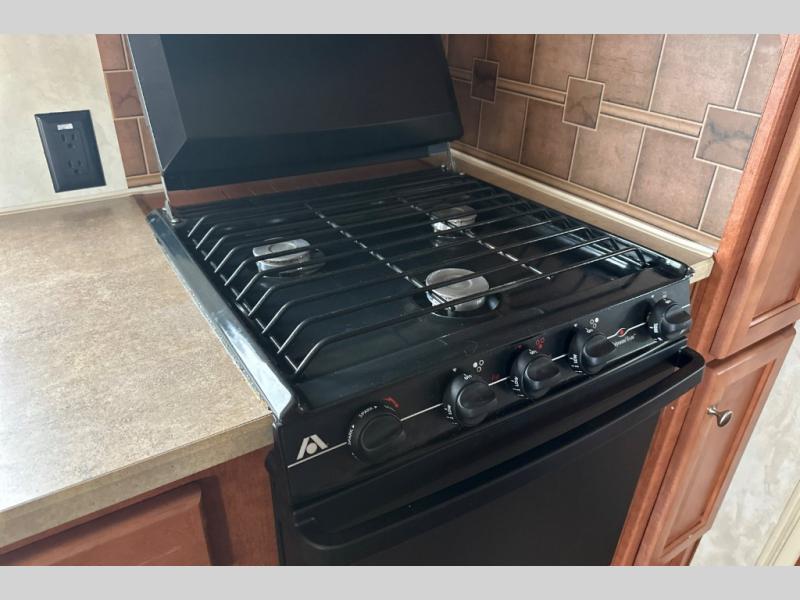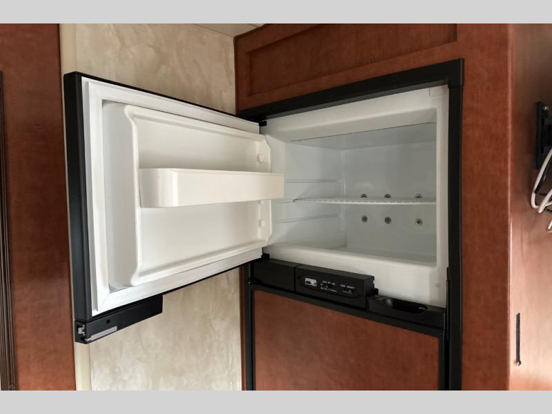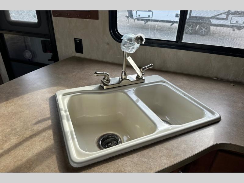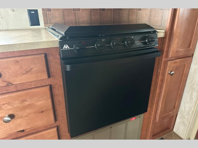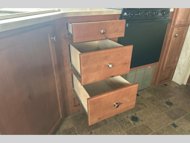The kitchen is to the left of the door and features an angled counter area with double sink, a three burner range, food pantry, and overhead storage for dishes and things. The refrigerator is opposite along the road side wall next to the dinette slide out. You can also add an optional TV next to the refrigerator if you like.