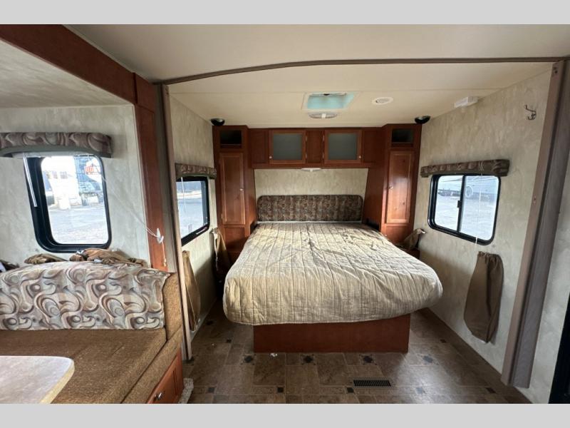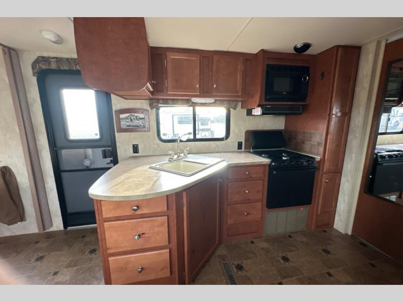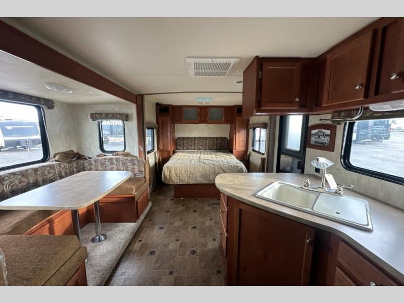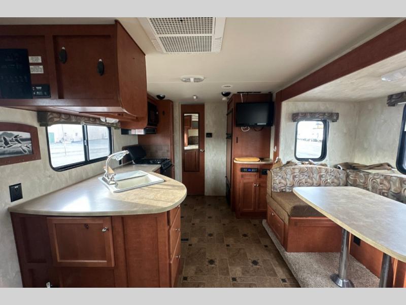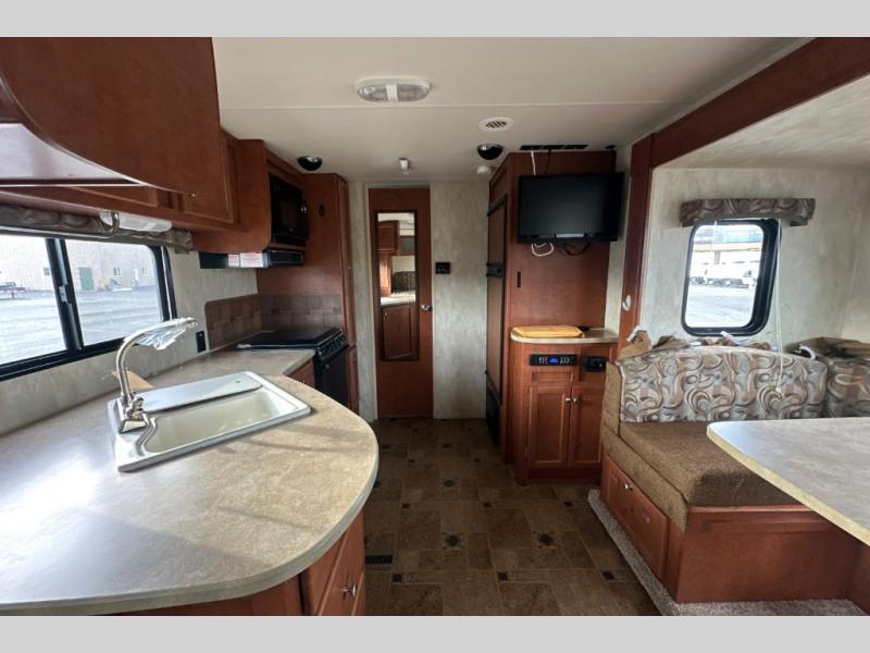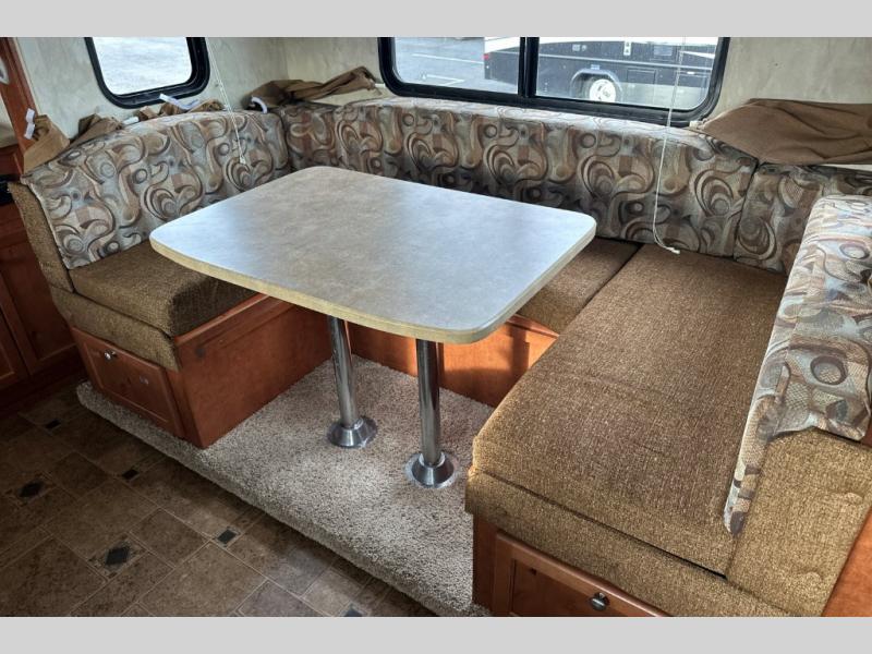 Straight in from the door find a slide out u-shaped dinette which creates more walking around space, plus provides ample seating during mealtime as well.