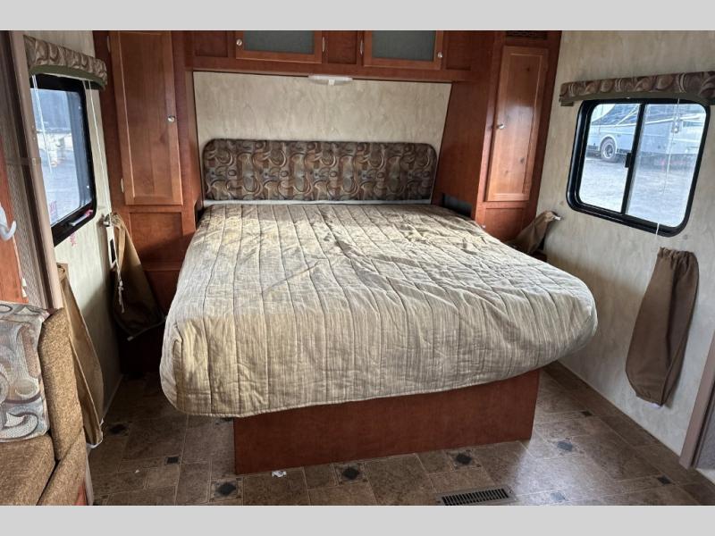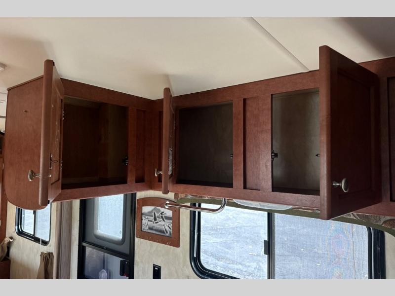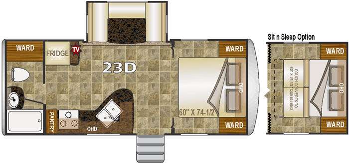 Enter and find a queen bed in front with dual beside wardrobes, plus an overhead cabinet the entire width of the trailer. You can choose the Sit & Sleep option where the end of the queen bed can become a couch during the day for more seating.