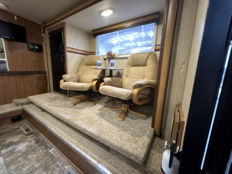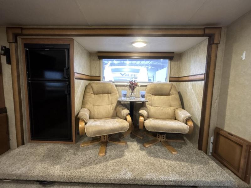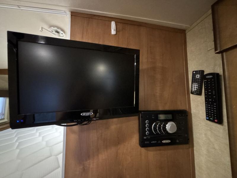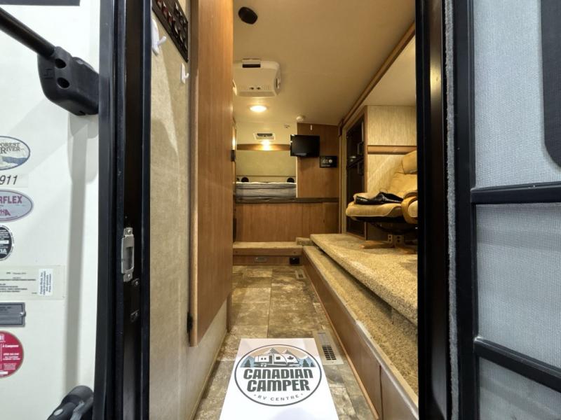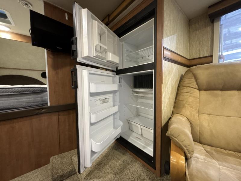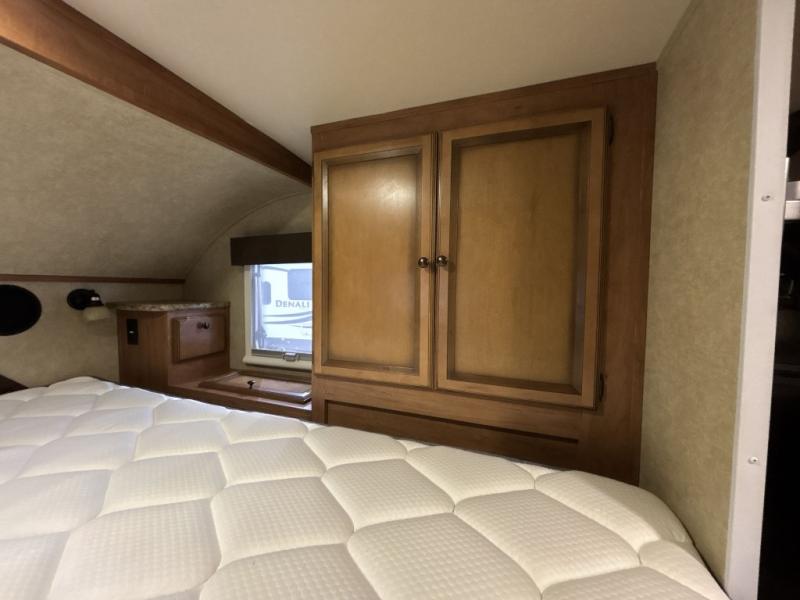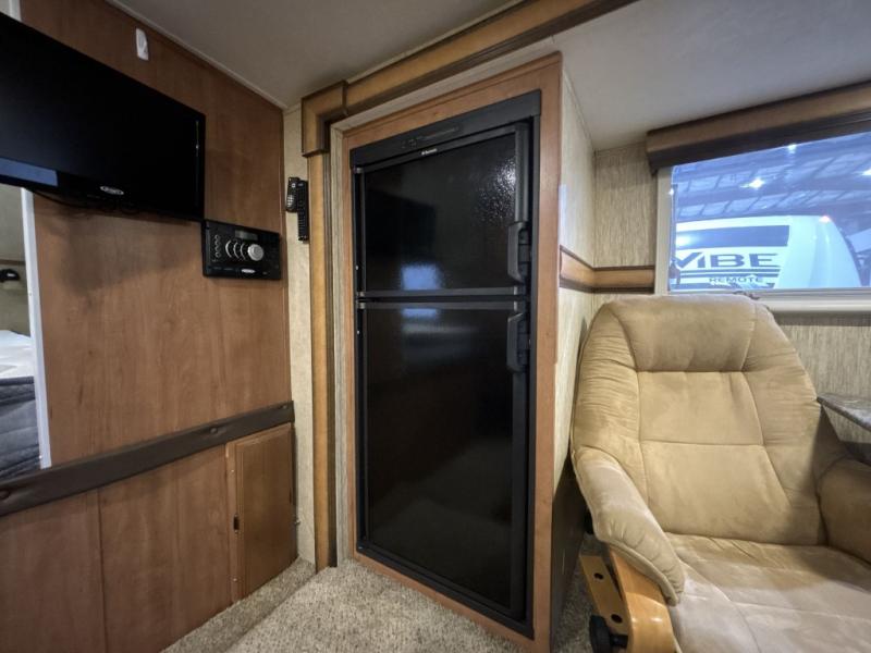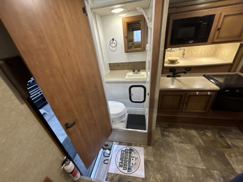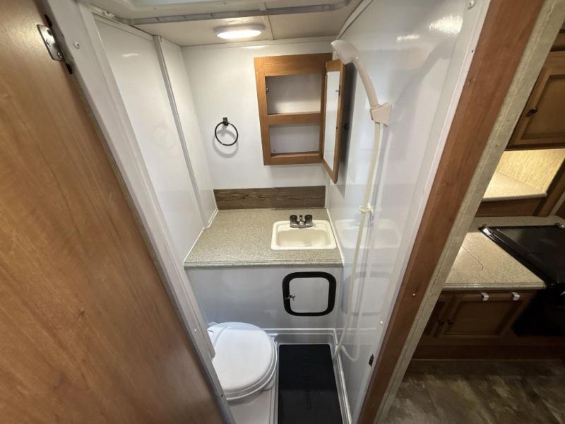 Step inside the rear entry door and find a slide-out 40" x 69" dinette and refrigerator. The dinette is perfect for meal time and can also be converted to sleeping space when needed too. Plus there is an overhead fold down bunk option that you can add for even more room for guests.