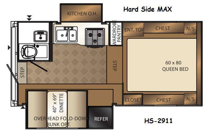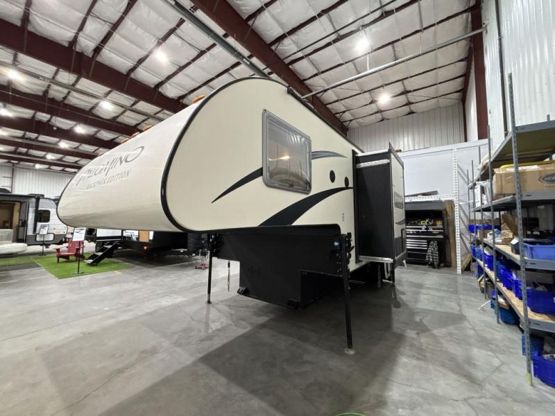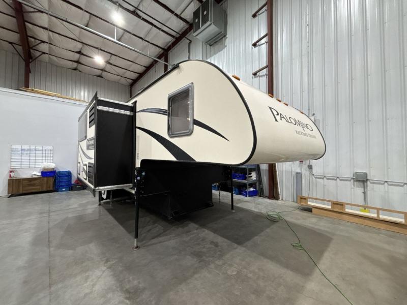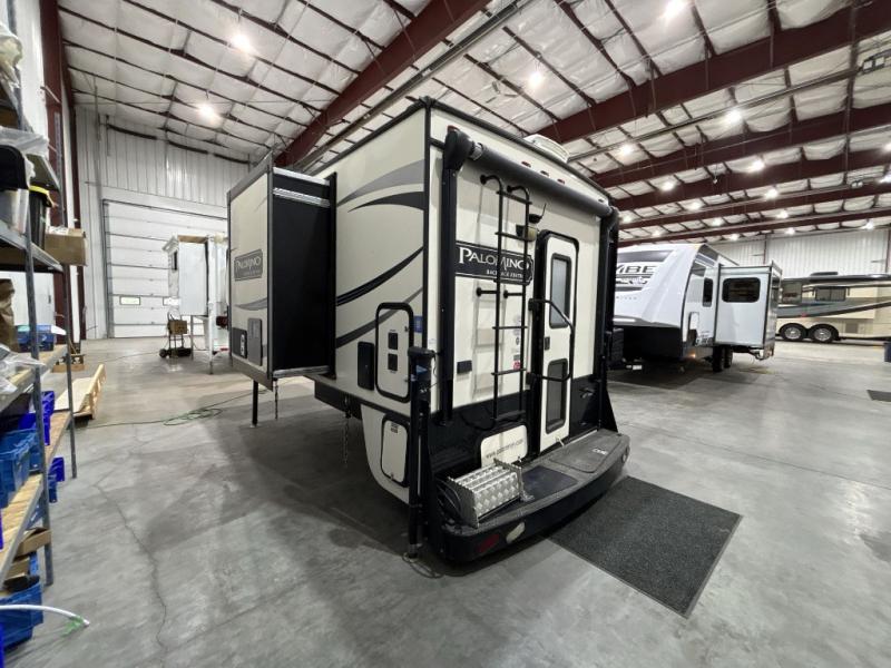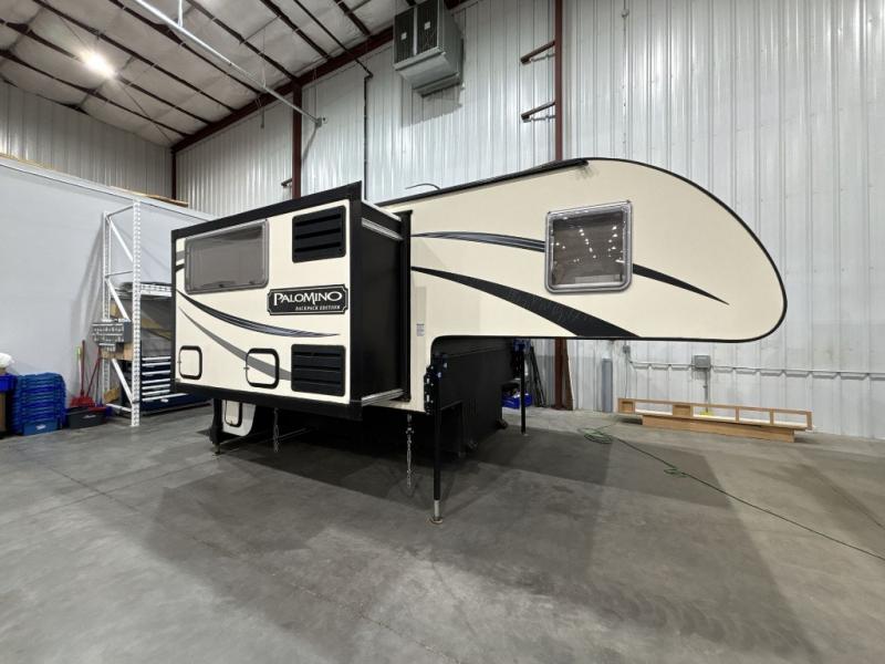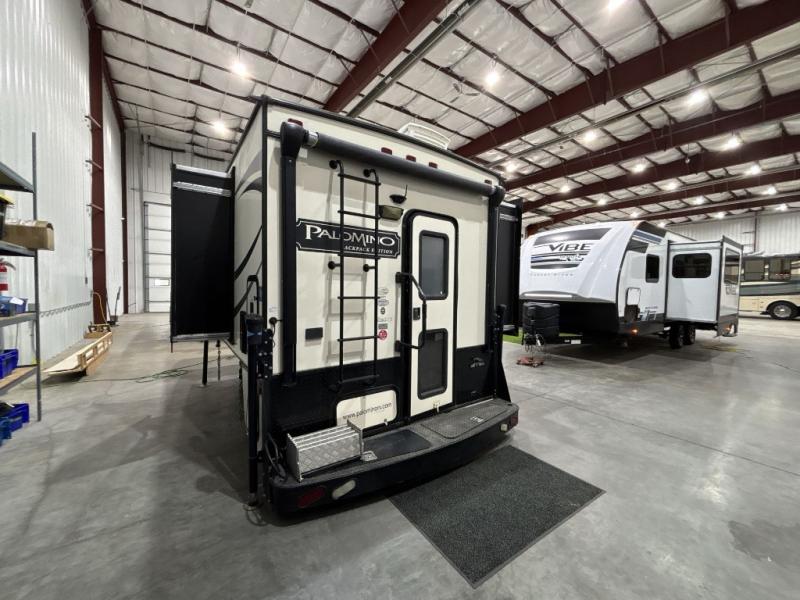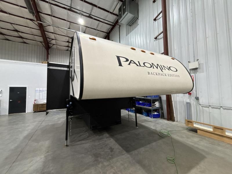 This Palomino Backpack Edition hard side MAX truck camper HS-2911 features double slides for added space, sleeping accommodations for four, and a convenient wet bath and more!