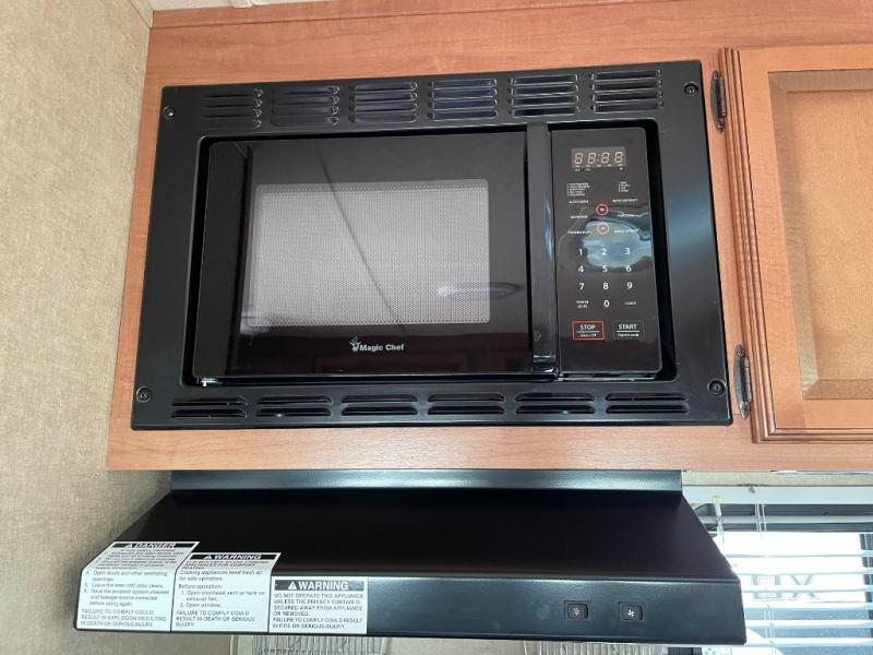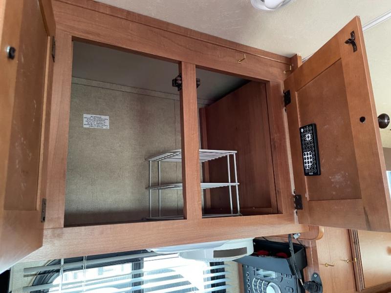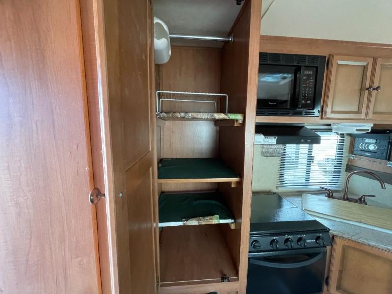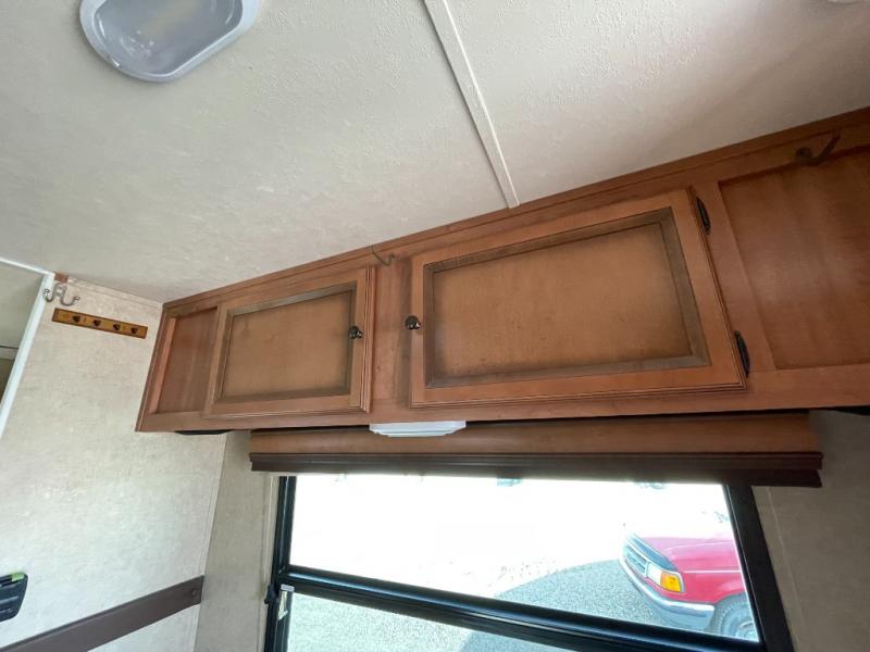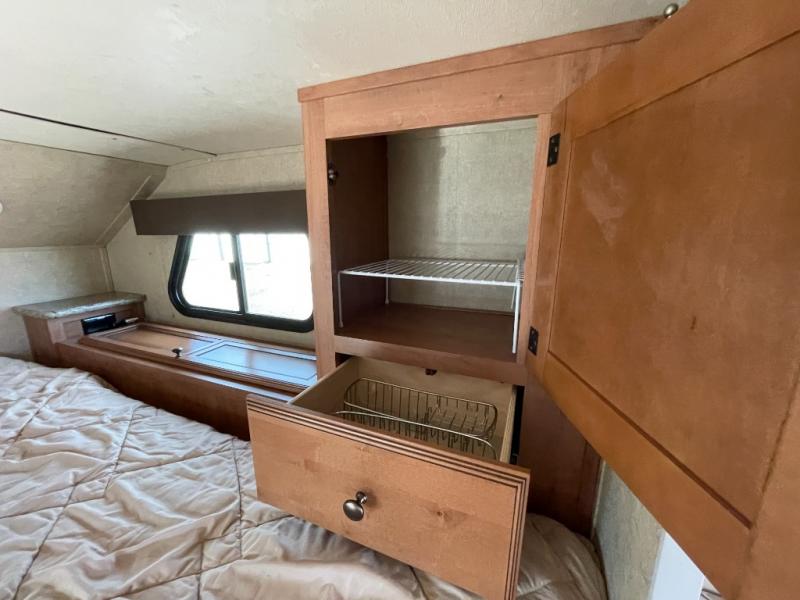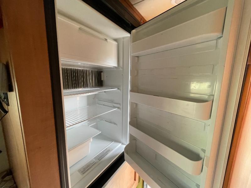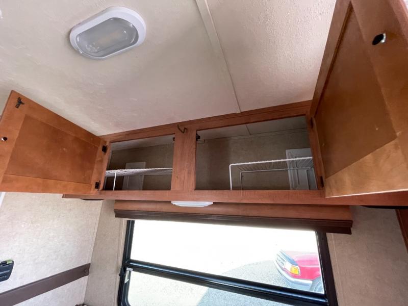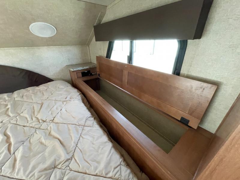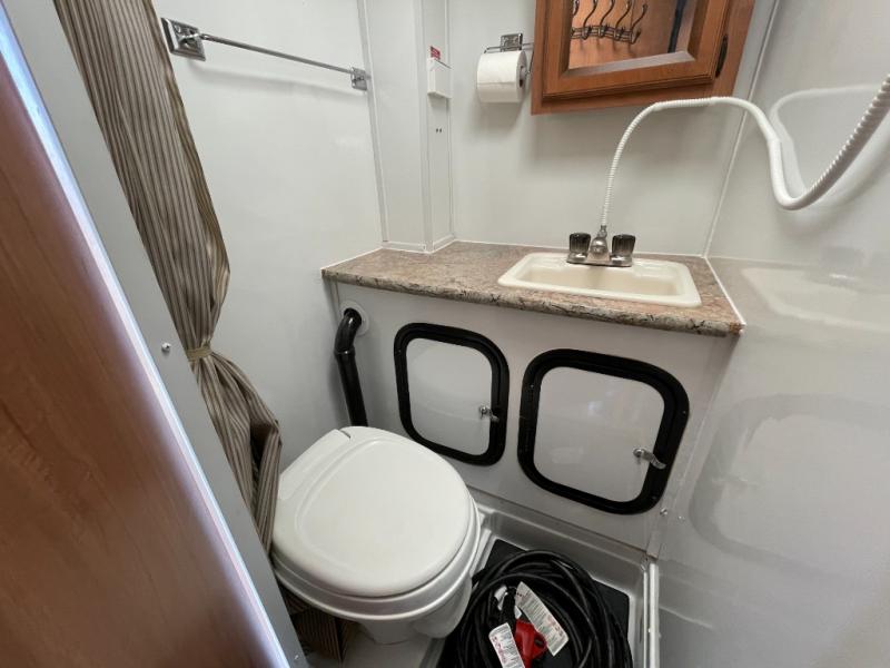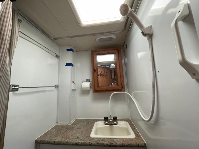 Step inside and find a refrigerator cabinet just inside the door on the right, and a wet bath in the rear corner on the left. The wet bath features a toilet, shower and sink, plus a dome for more natural lighting.
