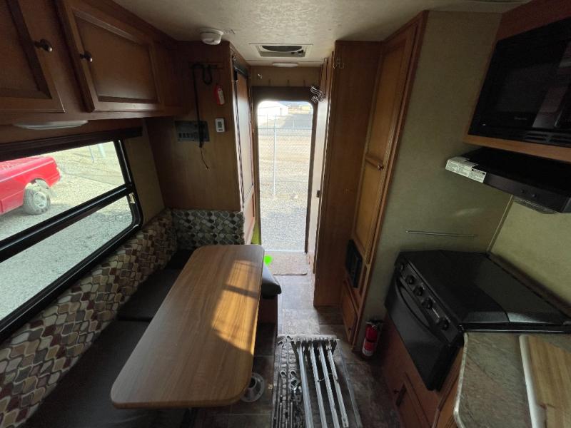 The dinette features u-shaped seating and an overhead cabinet along the side wall above.