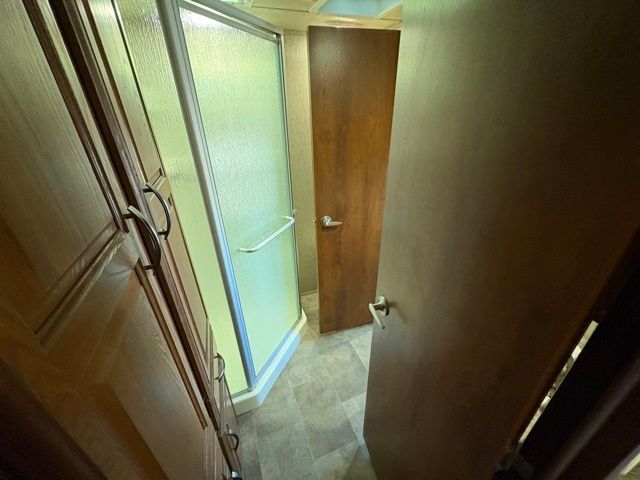 Head up the steps to a side aisle bath and front master suite. The bath offers a neo-angle shower, toilet, sink, and linen cabinet. A second door in the bath takes you directly into the front bedroom, or you can use the hall entry door instead.