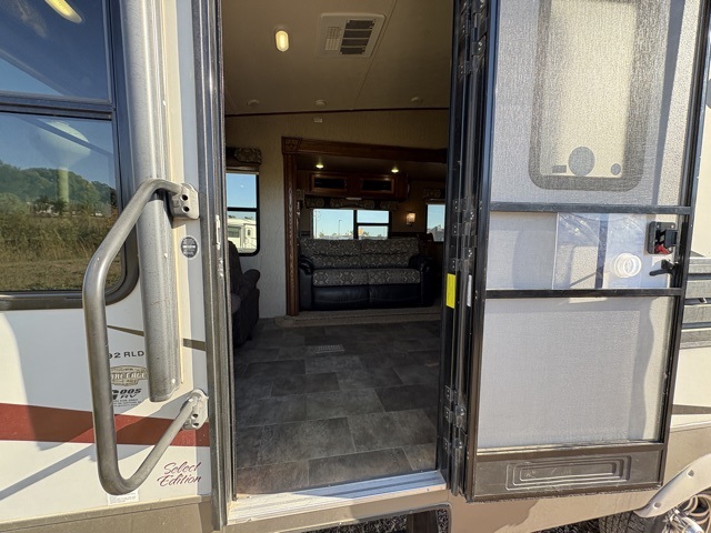 As you enter model 292RLDS notice the two swivel rockers with end table to your left along the rear wall with overhead cabinets above. There is a corner entertainment center on the right as you enter, and a slide out sofa and booth dinette straight ahead inside.