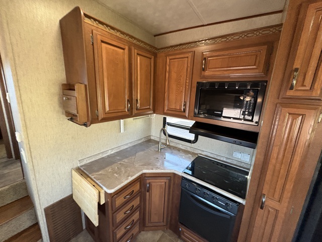 Cook meals and snacks for your family easily in the kitchen with a refrigerator, pull-out pantry, three burner range, and double kitchen sink.